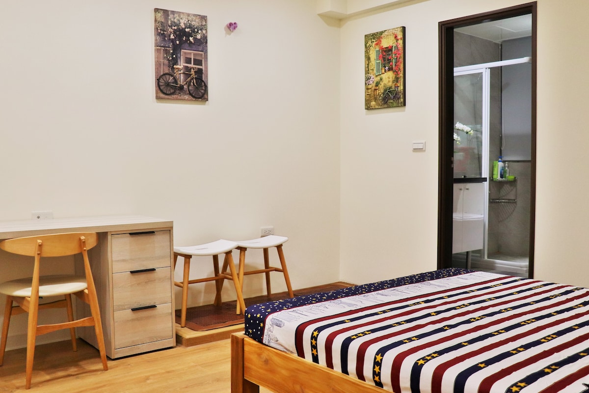 🏠房间特色 • 温馨工作室设计,适合1-2人入住 • 配备舒适Queen Size双人床 • 轻巧厨房配冰箱微波炉,方便轻食料理 • 独立休憩区,营造居家放松感 🌙 居住环境 ▸ 纯住宅区,夜晚安静好眠 ▸ 巷口即有超商、文青咖啡厅 ▸ 步行5分钟到红树林生态步道 🚇 超强交通 ① 淡海轻轨「竿蓁林站」步行2分钟 → 1站到红树林站 ② 淡水信义线「红树林站」步行7分钟 → 直达台北101(约45分钟) ③ 轻轨1站到淡水老街,吃阿给、看夕阳