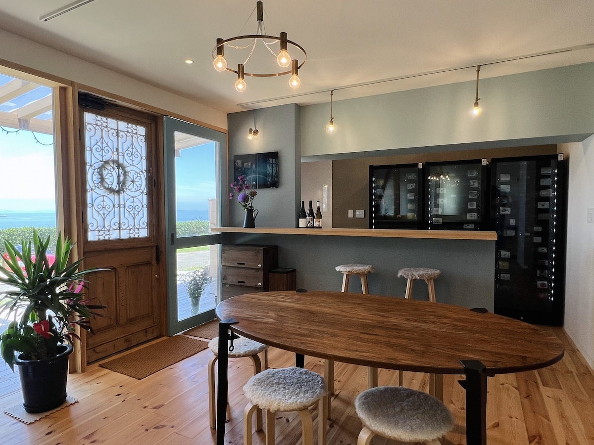 愛媛県伊予市下灘駅の近くの海岸沿いに、一日一組限定の一軒貸しの民泊施設がオープン。 目の前に広がるのは見渡す限り美しく青く澄み渡った空と海。 漆喰をベースに落ち着いた空間を演出。 瀬戸内海を一望でき海の目の前で一階には、夕日を見ながら、スタイリッシュなキッチンで料理ができます。 二階には、テラスで夕日を見ながら、つくろぐことができます。 クイーンサイズのベットが一つ。クイーンサイズに変わるkoalaのソファーベットが一つ。 二階には、ダブルのベッドが一つ。 最大4名様まで宿泊できます。 朝ごはんの自然酵母パン、ロダンコーヒー、付きです。 食器は、愛媛県出身陶芸家の佐々木智也の作品と、ムスタキビ、龍泉窯を使用しております。タオルは、今治タオルの伊織のタオルを使用しております。 シーツは、リネンを使用しております。 もし、ご夕食が必要な場合は、隣接しているShiojiレストランで、ゲスト様のみ使用する事ができます。 駅への送迎は無料でしております。 豊かで想い出に残る素晴らしいひと時をお届けします。 他には類を見ない瀬戸内の絶景を望む別荘でお楽しみください。