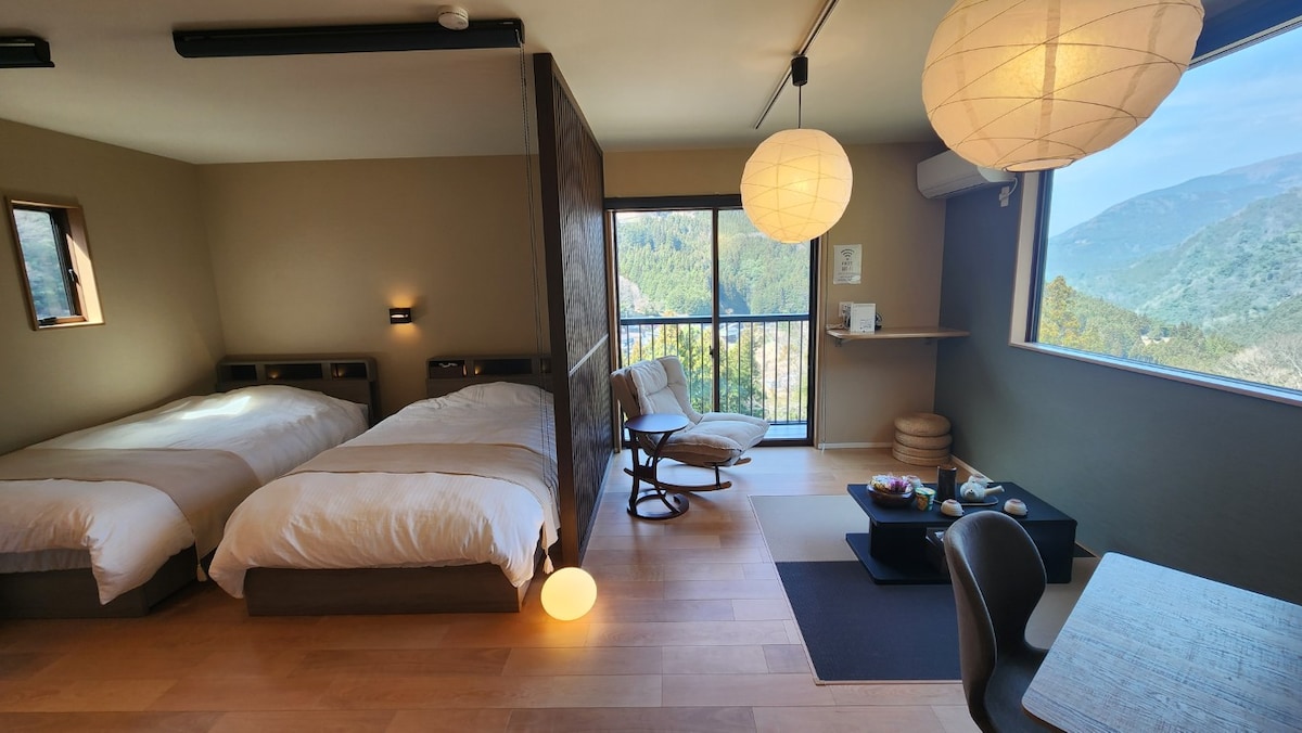 位于四国群山中的舒适私宅,由一间宁静河畔的旧咖啡馆改建而成。阳光洒满开放空间,宁静的乡山景色让您放慢脚步,舒缓身心。 在木质露台上享用茶或咖啡,或在星空下度过悠闲时光。伴随河水与鸟鸣,感受内心的宁静与放松。 室内展示了艺术家Keiko Hibino的作品,营造与自然和谐的沉浸式艺术体验,是放慢节奏、享受静谧的理想之所。附近可划独木舟或漂流。商店车程5分钟,Montbell公园10分钟,高知市或祖谷峡约60分钟车程。 *由于被自然环绕,根据季节不同可能会遇到昆虫。若您非常怕虫,我们不会强烈推荐;但若您能与自然共处,这将是一次难得的住宿体验。