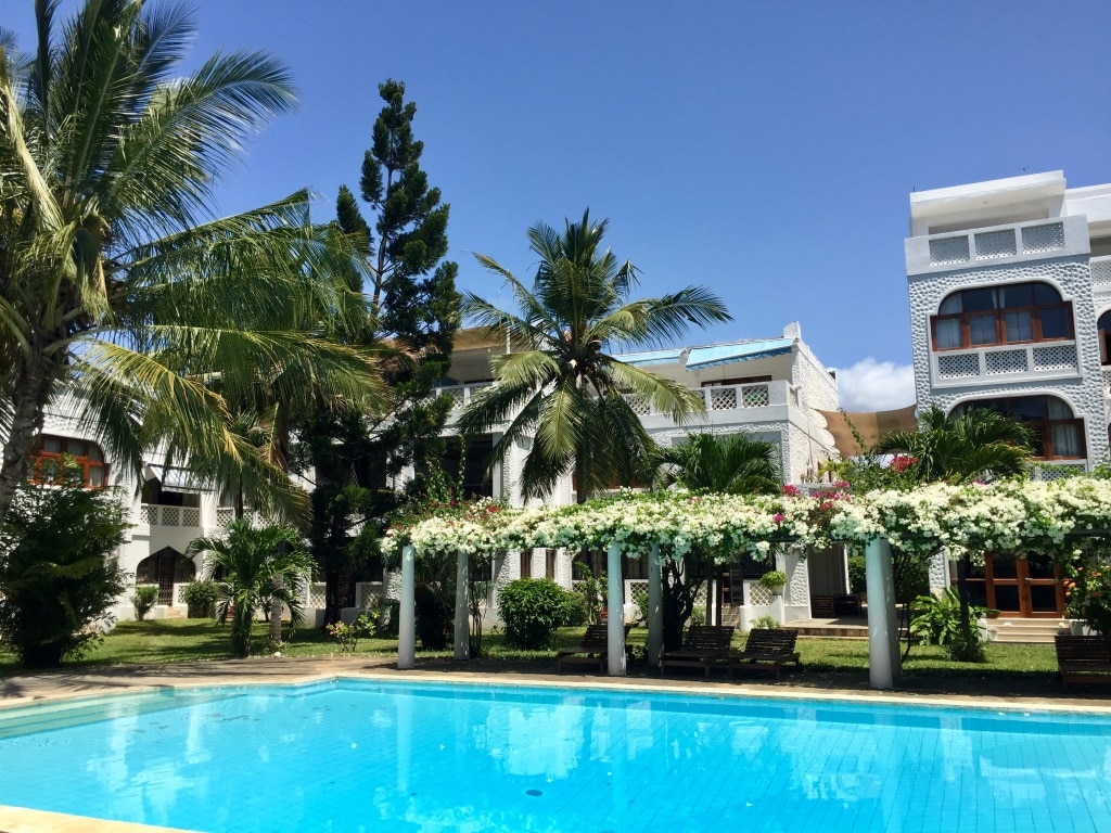 Delightful one bedroomed self contained guest house in mature compound, only paces away from one of the most beautiful beaches in Kenya. Five minutes from the shopping centre, airstrip, golf course and hospital. Free pick up from local airport and from Mombasa cost 6000 ks.local trips can be arranged and, trips to Mombasa to see the old town and Fort Jesus. we have the famous endangered Colobus monkeys in the garden. most afternoons we have a wooly necked stork sometimes 2 visiting the pool.