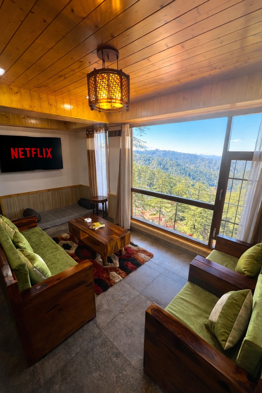 Glamoreo, just 1 hour away from Shimla. Stunning walnut wood interior, including all the furniture. Outdoor wooden bathtub, perfect for soaking in the fresh mountain air. The surrounding area is open and spacious. You can walk around, take in the scenic views, and get a feel for rural life. Everything here is organic, from food to dairy products. If you don’t feel like home-cooked meals, there are cafes and restaurants just 3–4 km away, and you can either visit them or have food delivered
