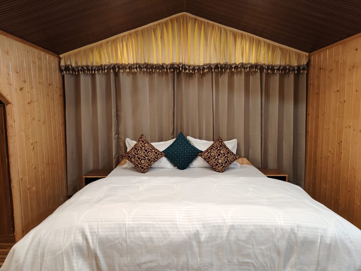 Glamoreo, just 1 hour away from Shimla. Stunning walnut wood interior, including all the furniture. Outdoor wooden bathtub, perfect for soaking in the fresh mountain air. The surrounding area is open and spacious. You can walk around, take in the scenic views, and get a feel for rural life. Everything here is organic, from food to dairy products. If you don’t feel like home-cooked meals, there are cafes and restaurants just 3–4 km away, and you can either visit them or have food delivered