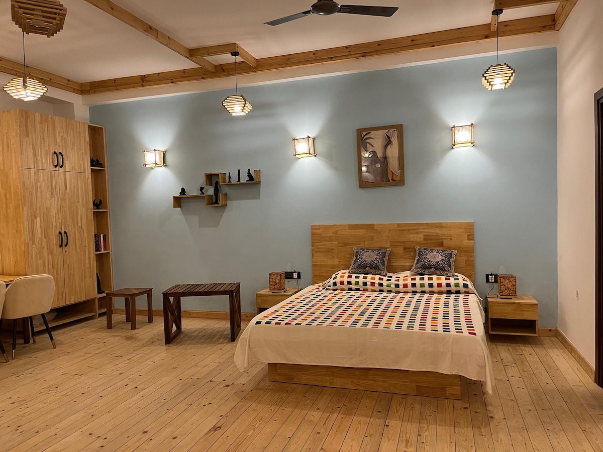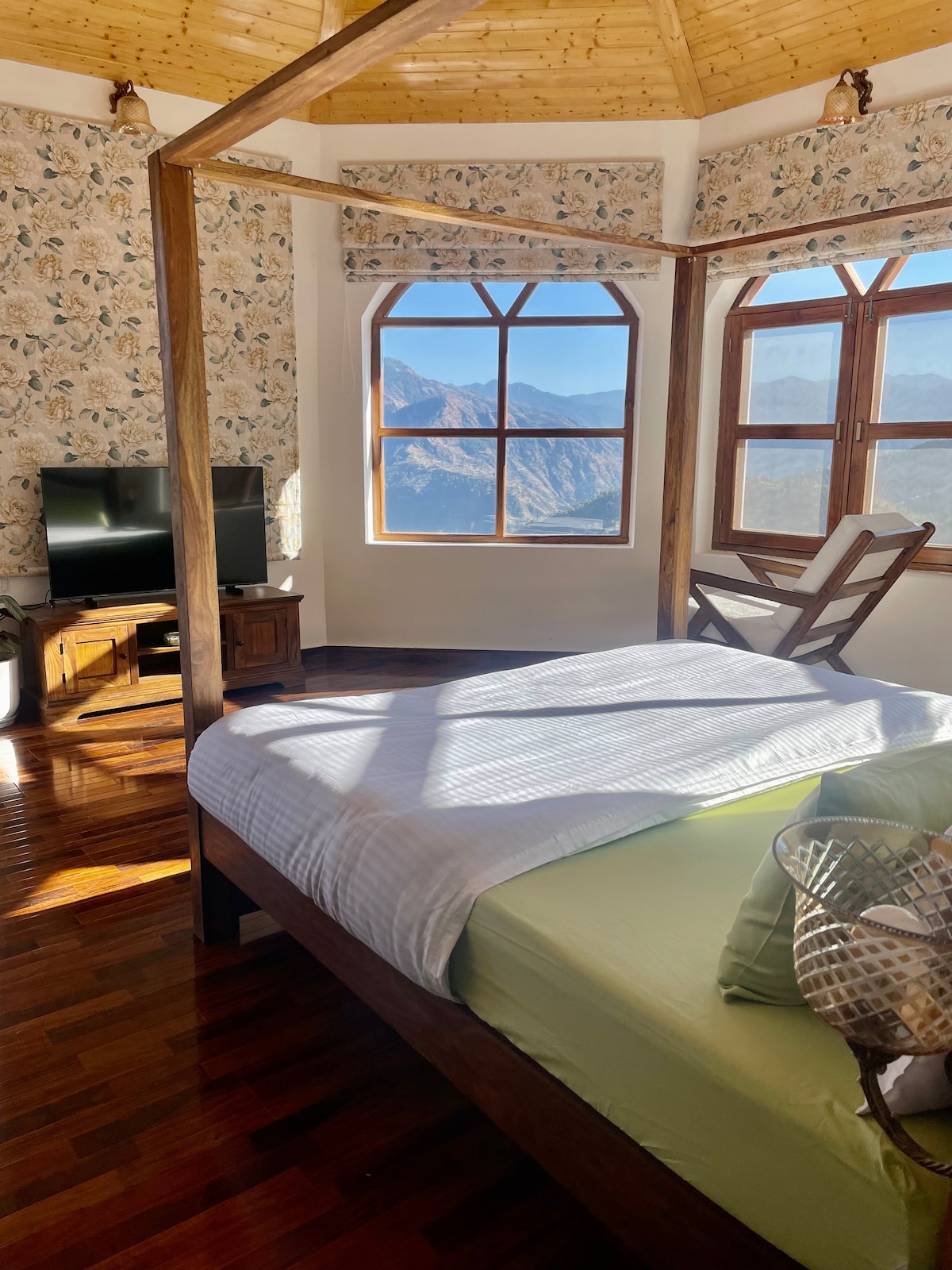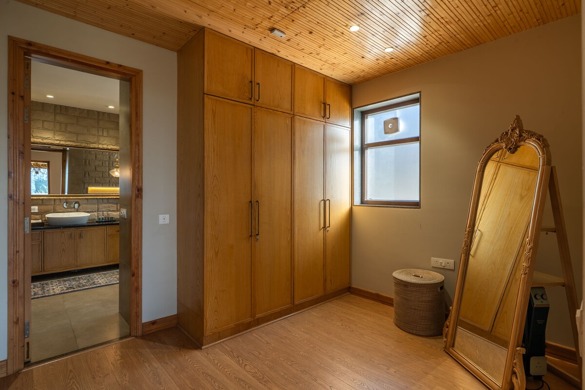 Glamoreo, just 1 hour away from Shimla. Stunning walnut wood interior, including all the furniture. Outdoor wooden bathtub, perfect for soaking in the fresh mountain air. The surrounding area is open and spacious. You can walk around, take in the scenic views, and get a feel for rural life. Everything here is organic, from food to dairy products. If you don’t feel like home-cooked meals, there are cafes and restaurants just 3–4 km away, and you can either visit them or have food delivered