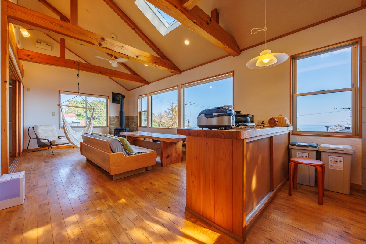 森の中にひっそりあるオーシャンビューのコテージで自然の音だけの非日常を体感してみませんか? パワースポットのハートの洞窟竜宮窟(ジブリ「紅の豚」のモデル)、田牛ビーチを通り、田牛の国立公園内にコテージはあります。 コテージの玄関を入ると目に飛び込んでくる、木々のグリーンと海のキラキラした光。20畳程ある吹き抜けのリビングには ソファ、キッチン、ロフト 、冬は暖炉とご家族やご友人同士の寛ぎの空間が広がります。 窓からテラスへ出ると海から広がる空と海を眺めるために作られたテラス。ジャグジー、ハンモックブランコでゆっくりと流れる心地よい風と空を贅沢に感じて頂けます。 テラスからもう一つ上へ 階段をのぼるとスカイデッキ。見渡しても自然のみ。はっと息をのむ絶景が広がります。 伊豆の海と漁船のゆったりとした流れ、聞こえてくるのは小川のせせらぎに鳥の声。最高のデトックスです。 今度は1つ階を下りると、森の中で川のせせらぎを聞きながらの炭BBQ。美味しくて楽しくて最高の思い出です。 夜になれば目が眩むほどの星空が広がりお天気が良ければ流れ星も!空の美しさを満喫していただけます。