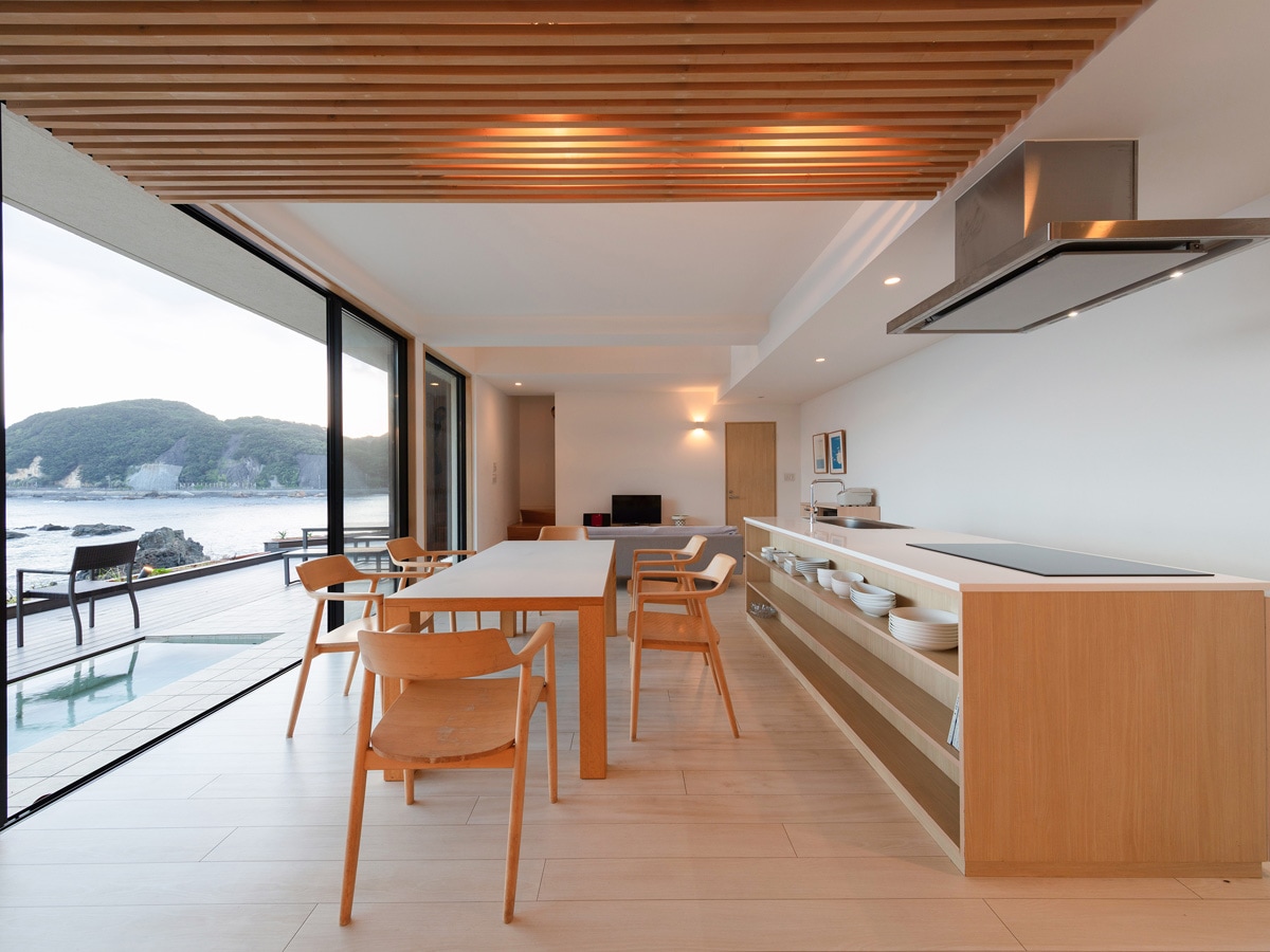 ”2坪の海岸線”「COVE KAWANA」は物語の始まりへ.. 「女子旅・映え旅行・記念日旅行」に大人気! 伊豆の東海岸で最も海に近いサウナ・露天風呂付きオーシャンフロントヴィラがオープン。 当宿のある川奈地区は、かつては海女漁が盛んな昔ながらの漁師町。 現在は、KAWANA BLUEと形容される程透明度が高く、多種多様な魚やウミガメも棲む有名なダイビングスポットして人気があります。 穏やかな川奈湾は、湾のまわりの丘陵地に住居が拡がり、さながら地中海のリゾートのような風景を醸し出しています。 当宿は、この地域の素晴らしさを五感で体感して頂けるよう、随所にこだわって設計をしました。 特に、宿自慢の特注2坪の大きな窓ガラスからの眺望は絶景で、お部屋の中にいると、ヨーロッパの地中海リゾートにいるような疑似体験を味わうことができると思います。 波の音を聞きながら、海をのんびり眺めて日頃の疲れを癒やしにきませんか。 屋外デッキにあるサウナは、海に突き出したインフィニティあぐらサウナとなっており、ロウリュウも可能です。 ※屋外浴槽とサウナをご利用のお客様は、必ず水着をお持ちください。