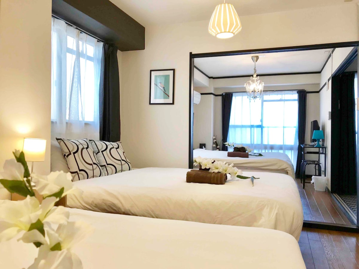 【b&旅行主题公寓·天下茶屋店】/双大床/最大4人/天下茶屋站7分/直达关西机场难波通天阁道顿堀