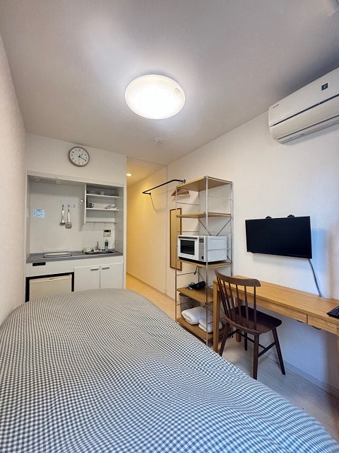 代々木エリアに位置する、1Kタイプのシンプルで機能的なお部屋です。最大2名様まで宿泊可能で、100cmのシングルベッドを2台ご用意。キッチンにはガスコンロや調理器具、冷蔵庫、電気ケトルなど、日常に必要な設備を完備しており、自炊も可能です。バス・トイレはセパレートで、浴槽付きのバスルームで旅の疲れもゆっくり癒せます。無料Wi-Fiや洗濯機も備えており、短期から中長期の滞在にも最適。代々木駅・新宿駅へのアクセスも良く、観光にもビジネスにも便利なロケーションです。清潔で落ち着いた空間で、快適な東京滞在をお楽しみください。