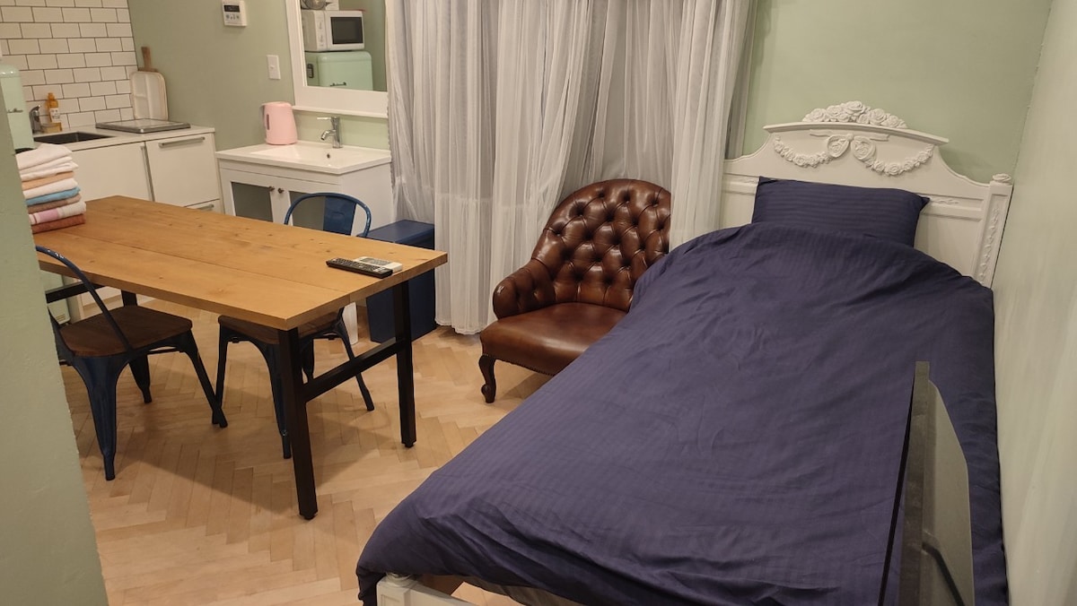 Welcome to RYU NO MA, a cozy loft room located on the 2nd floor, featuring two single beds and unique wall art inspired by mugen nō — the dreamlike world of traditional Noh theater. Just 4 minutes on foot from JR Yamanote Line "Otsuka Station". *Self check-in and check-out. *10 minutes to Shinjuku / 18 minutes to Shibuya by JR train.