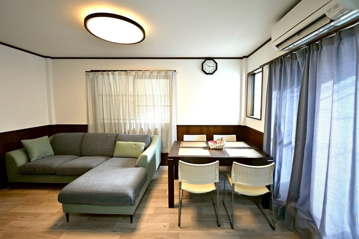 和の温もり溢れる広々空間で、心安らぐひとときを この民泊は、和の心地よさを感じる広々とした空間で、最大10名まで宿泊可能。日本の伝統的なデザインに現代的な快適さを融合させ、和の落ち着いた雰囲気を大切にしています。木の温もりが感じられる家具や、自然な色合いのインテリアが、心を落ち着ける空間を作り出しています。 リビングや寝室は、シンプルでありながらも心地よく、ゆったりとした時間をお過ごしいただけます。和の美しさを取り入れた空間に、心安らぐひとときを提供するためのベッド5台、ダイニングテーブル、ソファなど、必要なものがすべて整っています。日本の伝統的な美学を感じながら、贅沢にくつろげる空間です。 細部にわたる和のテイストが、忙しい日常から解放され、ほっと一息つけるような空間作りをしています。日本ならではの温かみを感じながら、現代的な便利さもしっかりと兼ね備えた、贅沢で快適な滞在をお楽しみください。