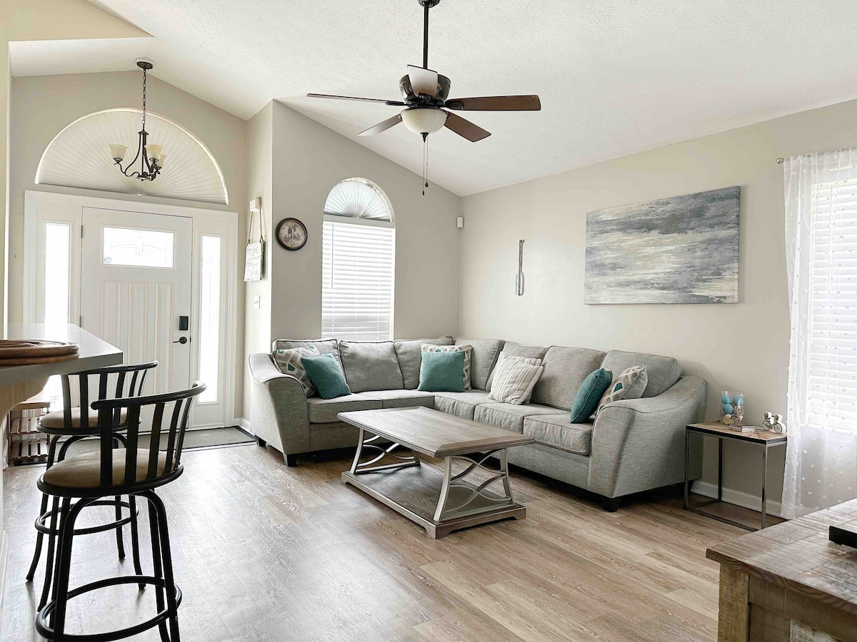 This beautiful family-friendly beach house is in an adorable, gated community with two pools and two parking spots in front of the home. This home sleeps 6 comfortably and features an outdoor fenced patio with a fire pit and gas grill for your family’s evening enjoyment. The home has been upgraded with Roku TVs with YouTube TV in the living room and all bedrooms. The kitchen is fully stocked for your cooking enjoyment and features new appliances, including the washer and dryer.