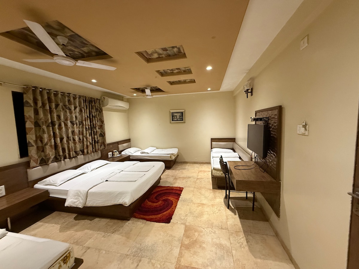 Spacious Four Bed Non-AC Room just 5 minutes walk from Sai Baba Temple. Ideal for families and small groups seeking a clean, budget-friendly stay. Features attached bathroom, free Wi-Fi, flat-screen TV, and daily housekeeping. Conveniently located near popular attractions like Sai Teerth and Wet N Joy Park. Free parking available. Paid airport shuttle service on request.