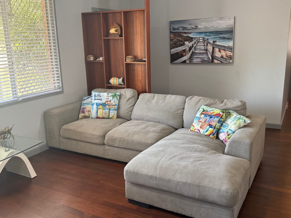 Kick back and relax in this calm, stylish space. This is a newly renovated private wing of our home with a separate entrance and courtyard. Located within 5 minutes walk to the beach and in close proximity to town and the race track. Guests have access to two bedrooms, each with Queen beds. There is a full kitchen and laundry and a spacious living area with a TV. The private outside area consists of an outdoor setting, deck and ample room to enjoy. Allocated with two parking spaces