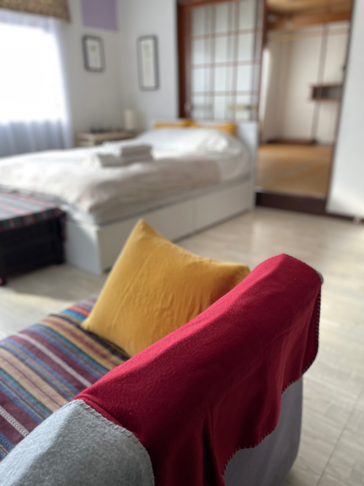 The entire house is available for private accommodation. A Japanese-style room with a double bed is ideal for 1–2 guests, and up to 5 people can stay using 3 futons and the bed. Surrounded by a large garden, it’s quiet and peaceful. Located on a steep hill—access by car is recommended. The kitchen, toilet, and shower room are private. A desk and chair are provided, making it suitable for long stays and remote work. Please note there is no air conditioning—fans are provided. Dog friendly!