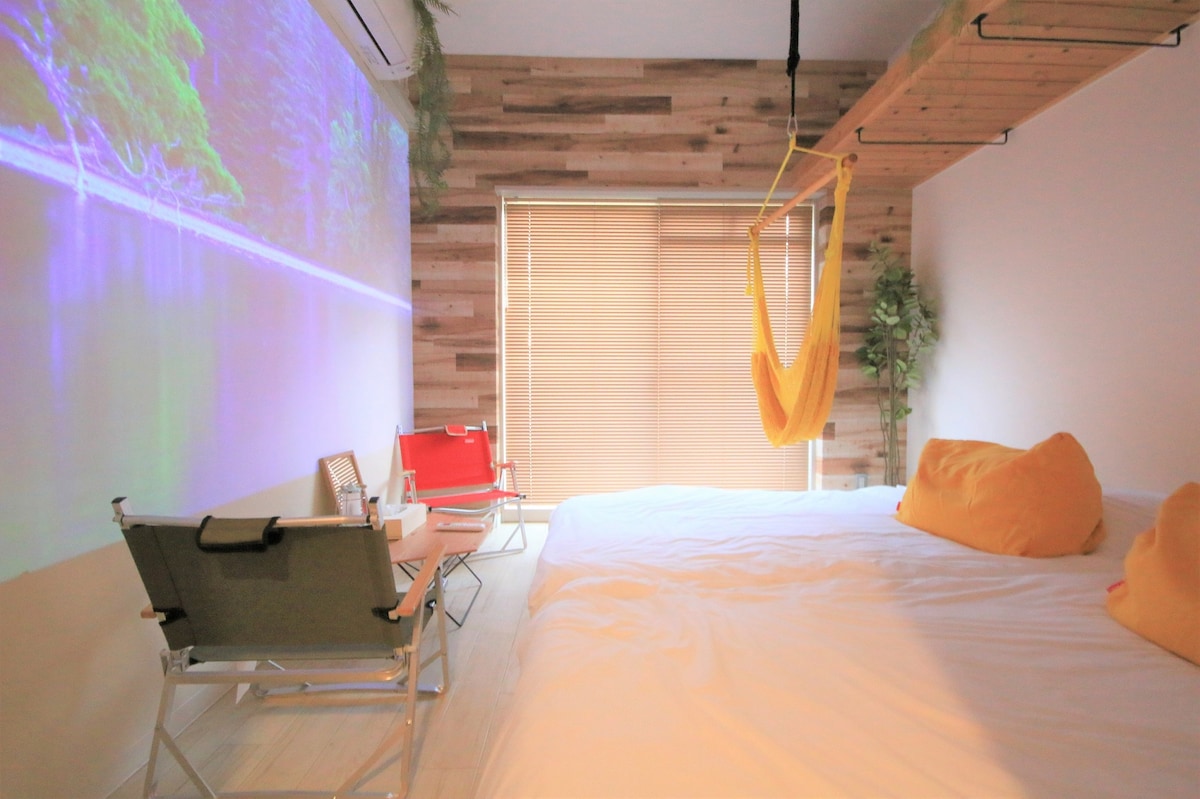 アウトドアスタイルで快適に過ごす「CAMP DOUBLE ROOM」! アウトドアの魅力を取り入れた「CAMP DOUBLE ROOM」ベッドとマットレスを使い分けることで、友人や同僚との滞在でも気を遣わず快適にお休みいただけます。 BBQはありませんが、BRUNOホットプレートを使って室内で焼肉やたこ焼きパーティーを楽しむことができます。 室内でもアウトドア気分を満喫できる工夫が盛りだくさんです。 設備一覧: セミダブルサイズマットレス(200×120)×1 ダブルサイズマットレス(200×140)×1 PopIn Aladdinプロジェクター(映像配信サービス対応) BRUNOホットプレート ミニキッチン(ケトル、冷蔵庫、調理器具、食器類完備) テントハンモック「CACOON」(直径120cm・耐荷重約100kg) 3点式ユニットバス ソロでの滞在や出張、二人でのゆったりした時間を楽しめる「CAMP DOUBLE ROOM」で、アウトドアスタイルの特別な体験をお楽しみください。