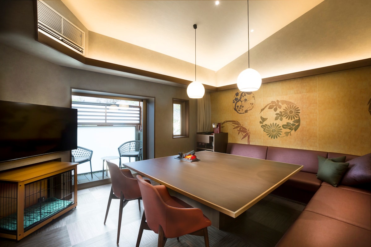 南に箱根山、芦ノ湖、北に金時山、東に明神ヶ岳等、箱根外輪山に抱かれた自然豊かな仙石原に佇む「箱根わんこ亭ゆにわ」。 セルフチェックインシステムを導入し、無人で運営しています。 プライベート空間を満喫できるよう設計されたお部屋は全部で4室。 すべて趣の違うデザイン・テーマカラーで設え、全室お帰りまでいつでも入れる温泉半露天風呂付客室となっています。 お食事はあえて提供せず、お客様ご自身が望む自由な滞在を楽しんで頂ける設備をご用意。キッチン、家電、冷蔵庫はもちろん、180㎝四方の大きくて贅沢なダイニングテーブルを備えました。 周辺飲食店で地元のグルメを楽しんだり、デリバリーやテイクアウトを利用したり、出張料理人を呼んでちょっとリッチなホームパーティーを開くなど、お客様それぞれの自由な滞在をお楽しみください。 お庭にはドッグランを整備し、わんちゃんと遊べる玩具やグランピングテント・ファニチャーを配置。 わんちゃんと箱根近隣の観光地を存分に楽しんだ後は、ここでしか味わえない至福のひと時をお過ごし下さい。 皆様のお越しを心よりお待ちしております。