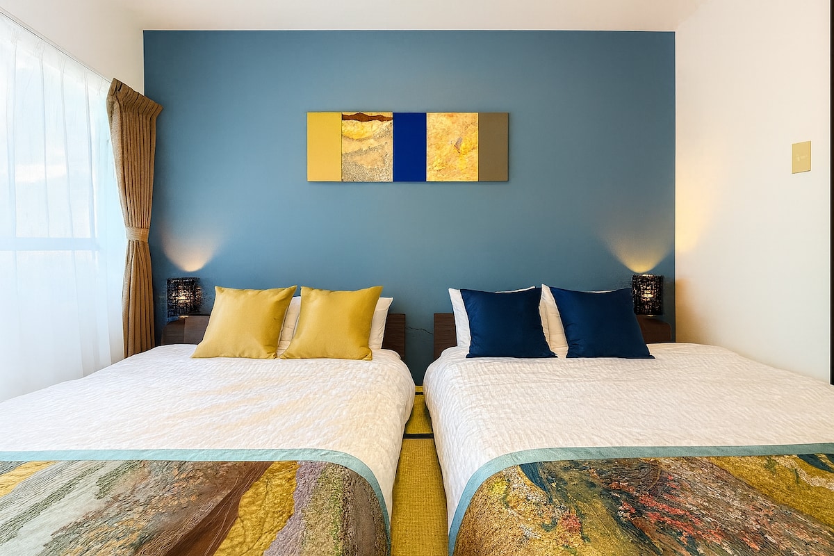 こんにちわ、Mickyです😄 河口湖駅から徒歩10分のアパートメントタイプの宿です。 アパート二階からの富士山の眺めはとても綺麗で、撮影スポットです☺️ コンビニ徒歩3分。 遊園地の富士急ハイランドも1駅でとても好立地。 部屋は私のこだわりで和室は桜柄の壁紙を天井まで張り巡らせました。さらに日本の伝統的な七宝柄や光が当たると金色に輝く壁紙もとても美しいですよ。畳を使った椅子や盆栽などのインテリアもあり、日本の【和】空間を存分に楽しんでいただけます。 部屋は4人まで宿泊可能です。 お子様用の食器や枕も準備しています。 ベッドは2メートルのとても大きなサイズで(2人)、畳にお布団を敷いて寝ることも可能(1人)。さらにおしゃれなソファをベッドにすることも可能。 日本の魅力を詰め込んだ室内と日本が誇る富士山を存分にお楽しみくださいね! ありがとう ※予約後、専用のシャワールームを案内します。また、シャワールームへ行くのに一度部屋の外に出て、隣の部屋へ移動する必要があります。少しだけ共用の廊下を通りますが、ほとんど他のゲストと顔を合わせることはないので、安心してください