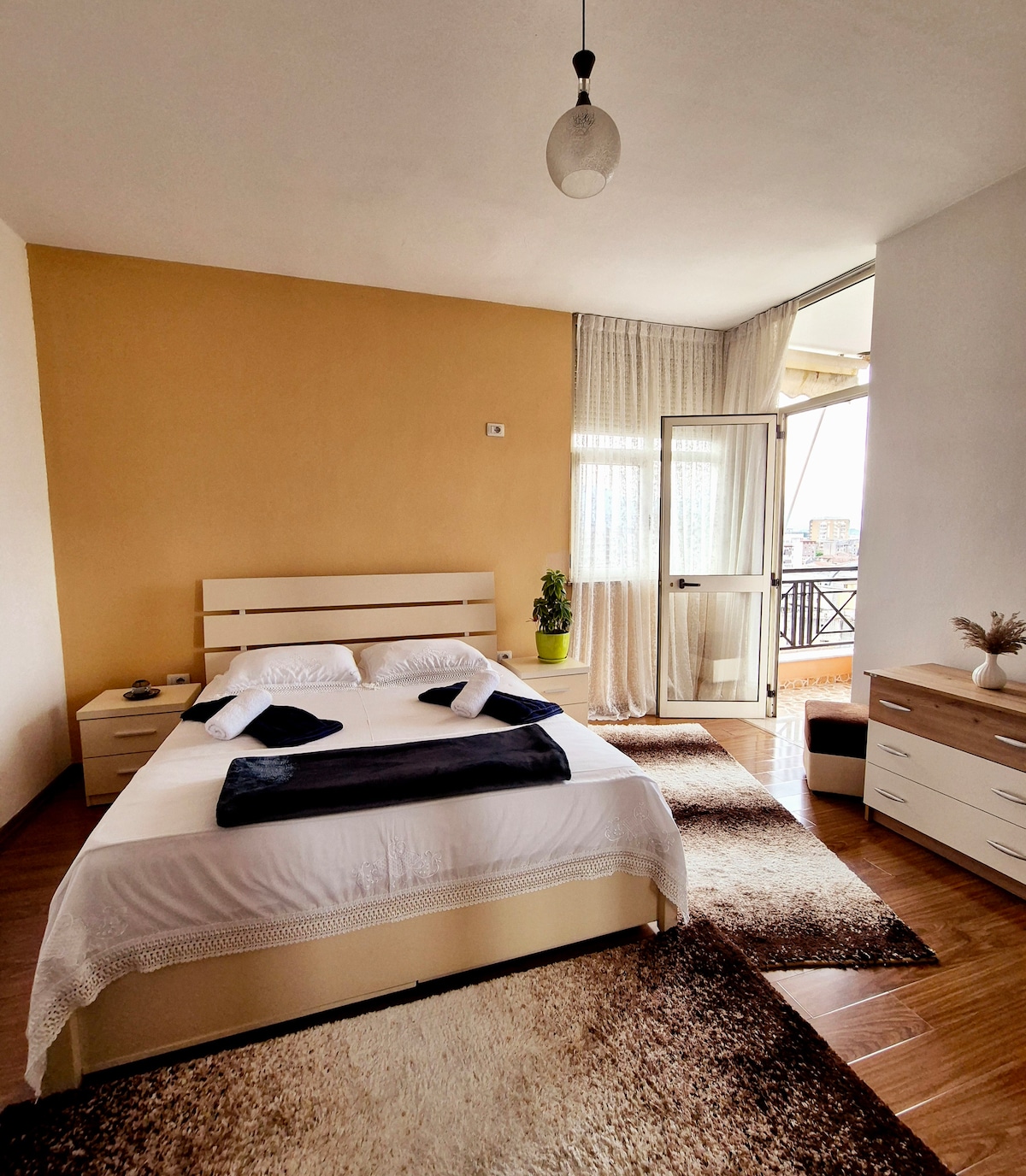 - Ampio appartamento con balcone vista 180 gradi sul centro città di Shkodra in uno dei più recenti palazzi del paese. - L’appartamento è formato da un ampia zona giorno luminosa con angolo cottura e accesso allo sfogo esterno, 1 grande bagno e 2 confortevoli camere da letto. - Situato in posizione strategica, a pochi passi dal centro e dalla stazione degli autobus e taxi, accanto al Teatro Migjeni. - La casa è stata ristrutturata recentemente con accogliente arredamento.