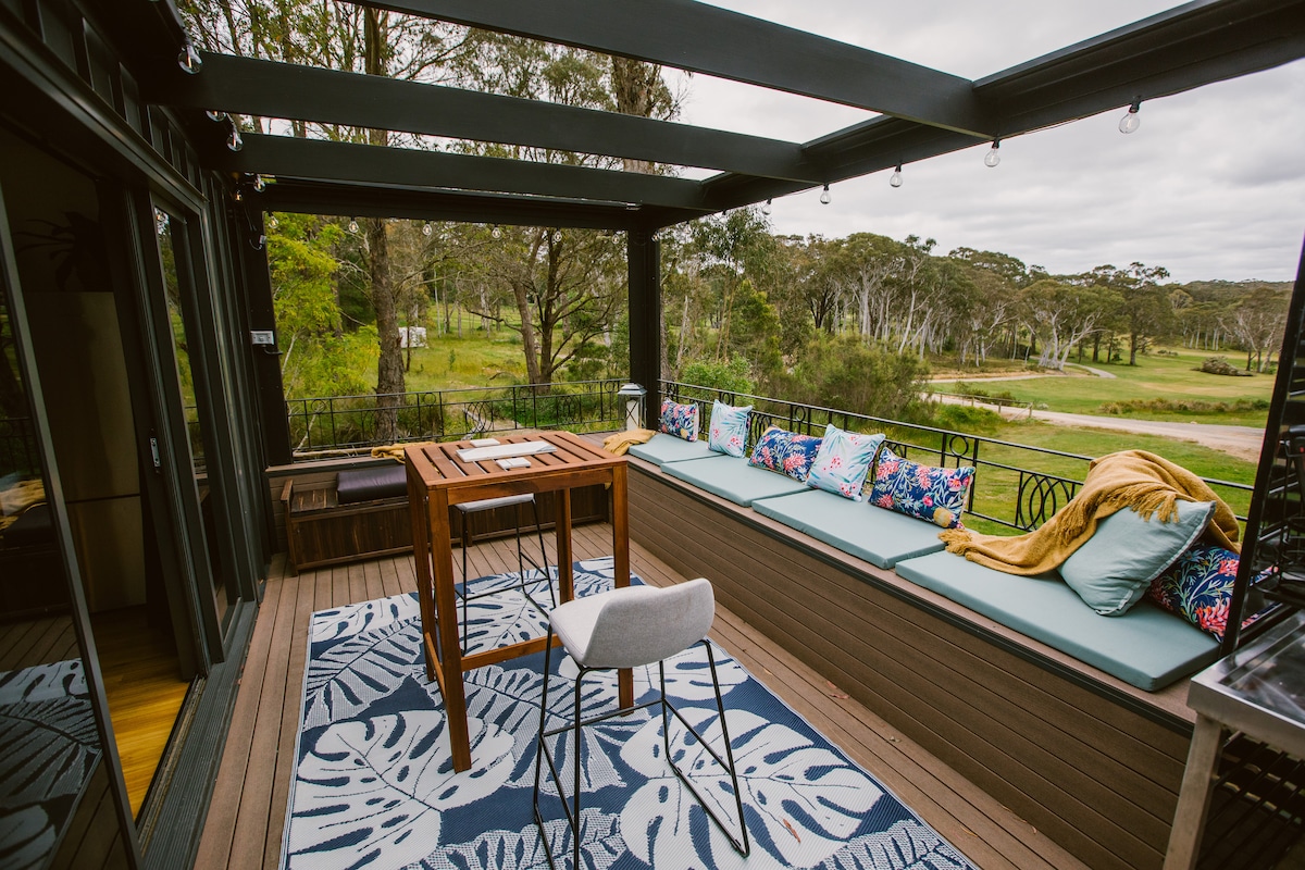 A beautifully designed architect home with sweeping escarpment views, rated 4.98 stars by 200+ guests and an Airbnb Guest Favourite. Sleeps 5 across 2 bedrooms – each with a private ensuite – plus a third bathroom, fire pit, BBQ deck, and a backyard where kangaroos visit daily. 81 Mbps WiFi and a dedicated workspace included. 100m to the village. Community pool across the road. Can be booked with The Tailor's Cottage for up to 7 guests.