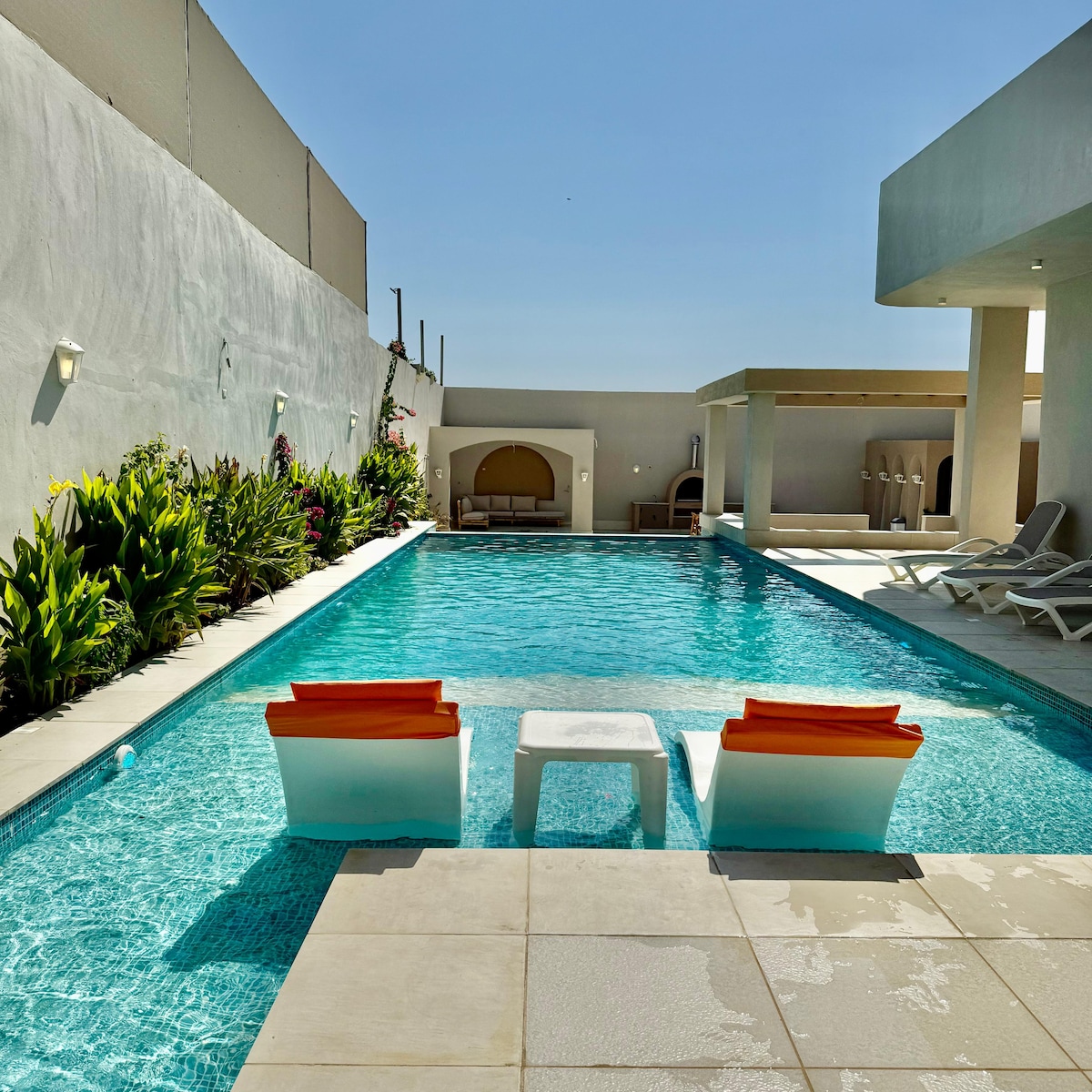 Enjoy with your family and friends with our amazing farms Rent your private chalet with full privacy and security Day use & overnight Chalet amenities Swimming pool (12*6) Depth (1.65) Sunbeds Various outdoor seating area Billiard Barbecue area Outdoor shower Living room Three bedrooms Two bathrooms Fully equipment kitchen Big Garage amazing and big Landscape