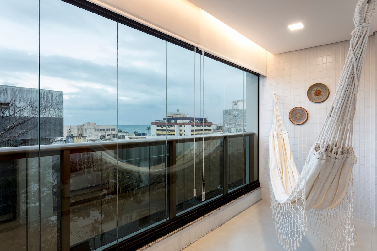 Managed by @Insider.Bahia - Apartment with sea view, a few steps from Farol da Barra beach, with cozy and very elegant decor. Bedroom and living room apartment, with air conditioning, perfect space for the home office with high-speed wi-fi, large and cozy balcony, fully equipped American-style kitchen. Apt has a free parking space. Located close to the "Farol da Barra" fort, beaches, museums, restaurants and bars, the space is an invitation to the beauties of Salvador.