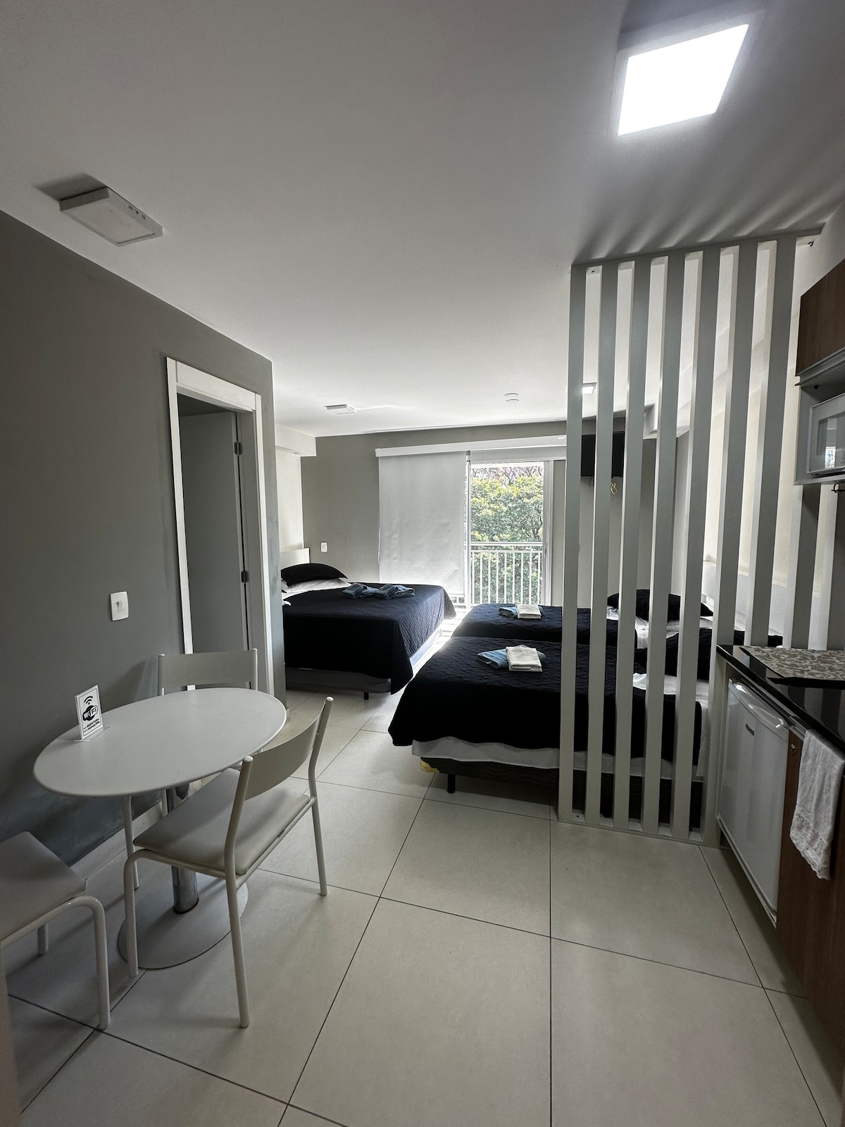O apartamento conta com cozinha equipada, banheiro com chuveiro elétrico , ambiente único com ar condicionado, condomínio possui toda estrutura para curtos períodos de viagem como lavanderia e mini mercado, além de conter academia e piscina no último andar. Está localizado a 800 metros do Terminal Rodoviário do Tietê (metro e rodoviária), a 1,5km do complexo Anhembi (sambódromo e centro de exposição), a 2 km do Expo Center Norte e Shoppings Center Norte e Lar Center.