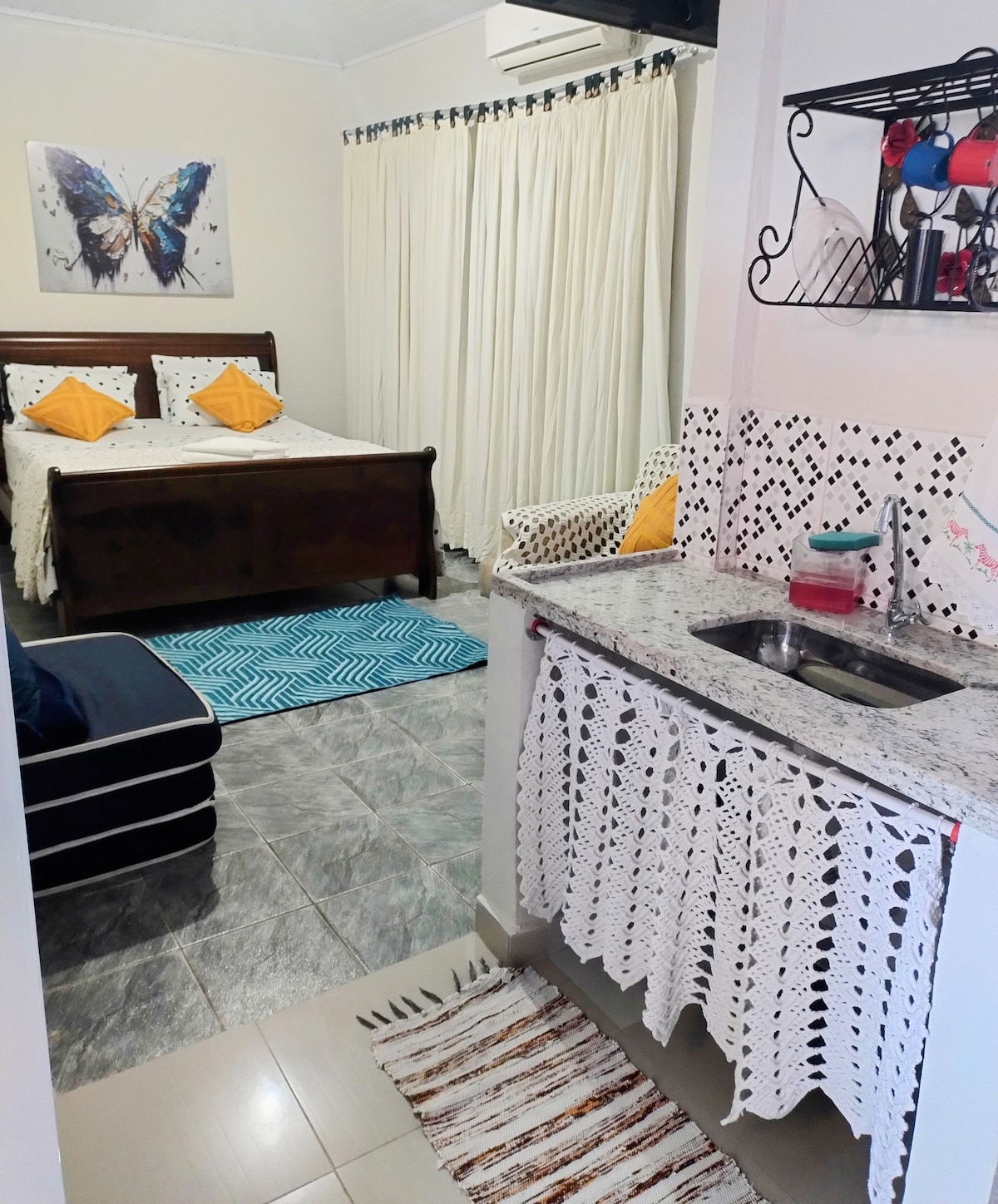 Um local pequeno mas agradável e limpo. É um quarto conjugado com uma cozinha e um banheiro. No quarto tem uma cama de casal e um armário,na cozinha tem mesa com 4 cadeiras , geladeira, fogão armário e eletrodomésticos. Tenho tudo o que precisa para um casal ou até 3 pessoas, podemos colocar um colchão extra! Não é apropriado para longas estadias,pois não tem área de serviço nem quintal. Fica no térreo. Se precisar de garagem podemos disponibilizar uma vaga a uns 10m do local.
