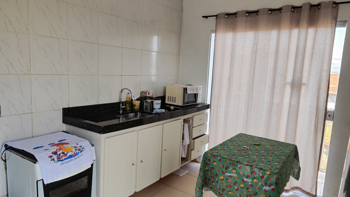 Mini casa completa para uma pessoa. Aconchegante e privativa, perfeita para quem gosta de tranquilidade. A kitnet tem colchão de mola, tv smart, internet, utensílios de cozinha, vários eletrodomésticos, roupas de cama e banho e utilidades domésticas. Além disso, conta com área de lazer e lavanderia, compartilhadas com os demais hóspedes das 6 kitnets do imóvel. Não temos estacionamento. Reserva feita para terceiros não será aceita, bem como não permitimos revezamento de hóspedes, nem visitas.