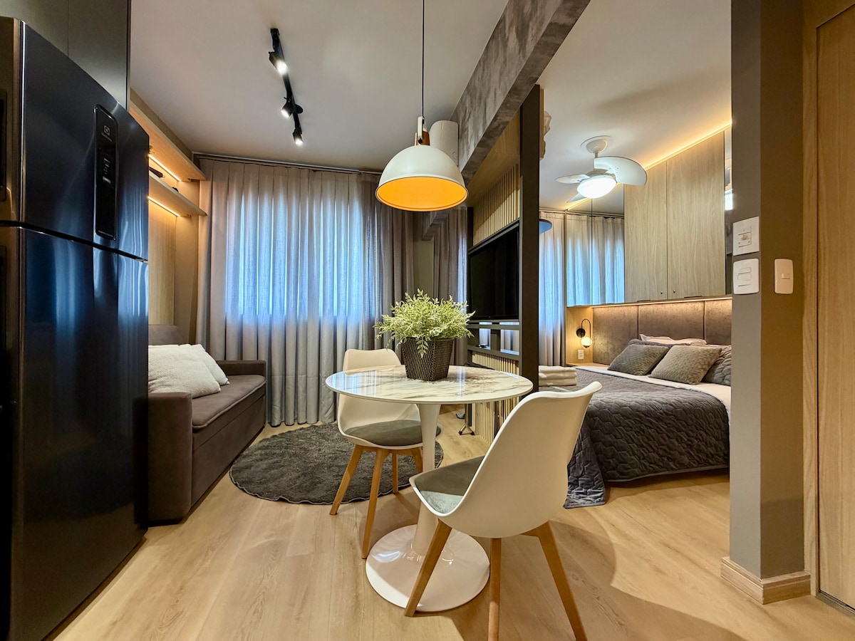 Studio moderno, novíssimo, aconchegante, perfeita localização, com uma linda vista da sacada, principalmente a noite . Wi-Fi rápido, mesa de trabalho, TV smart 55” , cama Queen. Ar condicionado (quente/frio). Máquina de lavar e secar roupa e uma linda ilha na cozinha. 50m2 de muito estilo-27ºandar, Silencioso. No Centro/Batel, próximo à comércios, bancos, shoppings, polo gastronômico e Hospital . No prédio :Piscina, academia, sala de jogos, sauna, jacuzzi, portaria 24 horas.