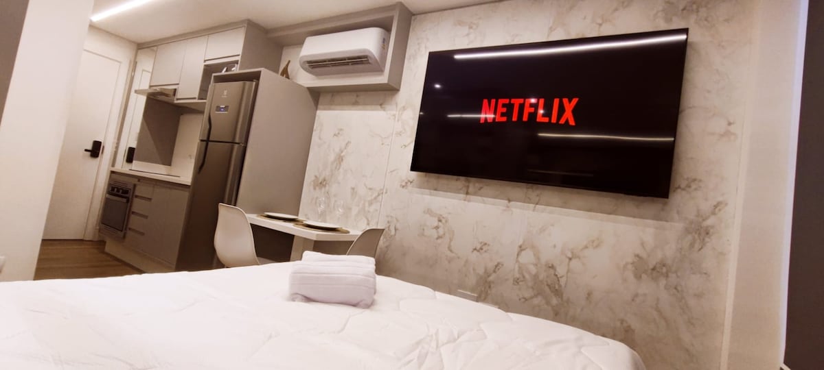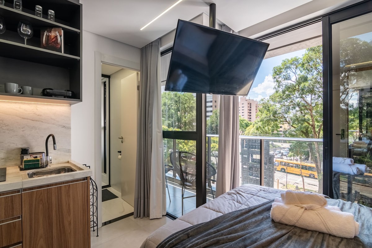 Bem vindo ao Studio Prime! Em uma das melhores localizações de Curitiba, próximo a tudo: Bares, restaurantes, Hospital Pequeno Príncipe, FAE e pontos turísticos. Tudo foi pensado para trazer praticidade e aconchego, com móveis planejados, cozinha equipada com Utensílios necessários. Smart Tv no quarto e na sala, ar quente e frio. Cama confortável, sofá cama, roupas de cama e banho. Para vc que vem a trabalho, a passeio ou outro motivo, esse é o Studio perfeito. Não perca tempo e reserve já!