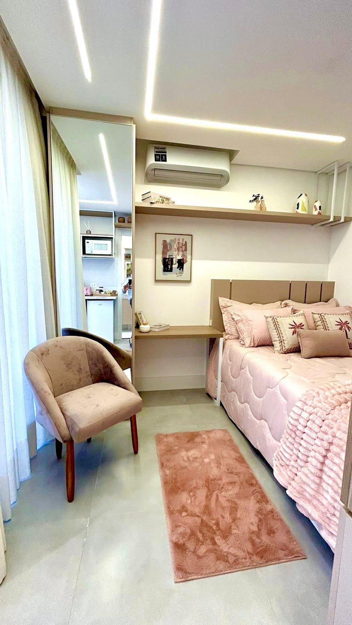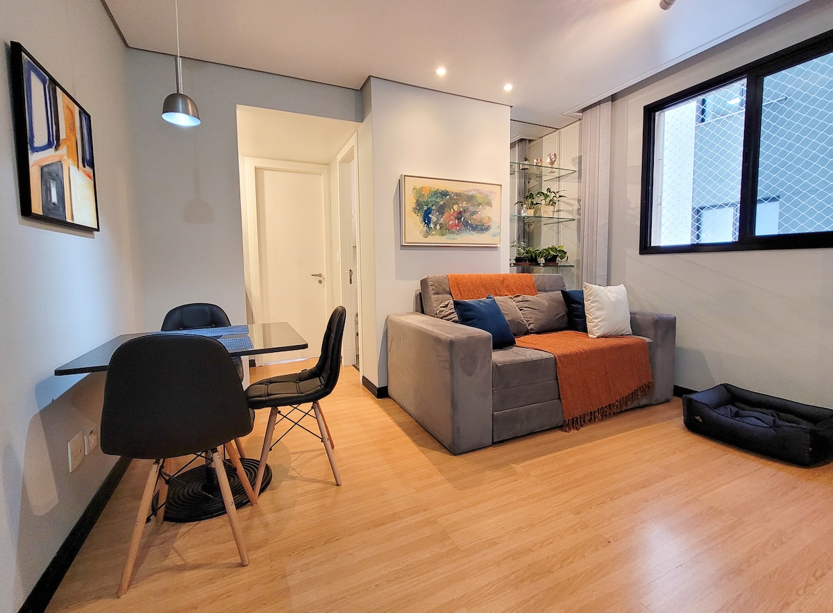 Apartamento aconchegante no Batel, ideal para quem busca conforto e praticidade em Curitiba. Conta com cozinha equipada (mesa de jantar, geladeira, cooktop e micro-ondas), quarto com cama de casal e bancada de trabalho, além de sofá-cama queen. Ar-condicionado quente/frio, blackout para noites tranquilas e ótima localização perto de mercados, farmácias, shoppings e restaurantes, com fácil acesso para quem está sem carro.