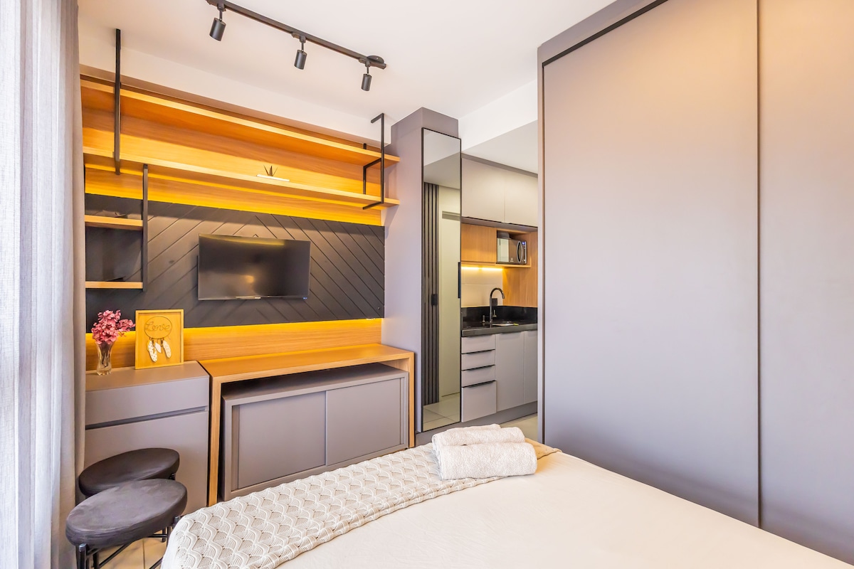 Studio de design exclusivo e alto padrão cheio de estilo, focado na melhor experiencia no AirBnB, ao lado do Shopping Estação. Gagarem não inclusa. Cozinha completa equipada com Geladeira, Fogão, Microondas , TV Smart 42", Cama Box Premium padrão Hotel, super ducha e wifi. Rede de proteção nas janelas e sofá cama muito confortável. No desejado Condominio LifeSpace, novo e com academia, piscina coberta e aquecida, espaço para SPA com sauna úmida e seca além de hidromassagem. Inesquecivel!