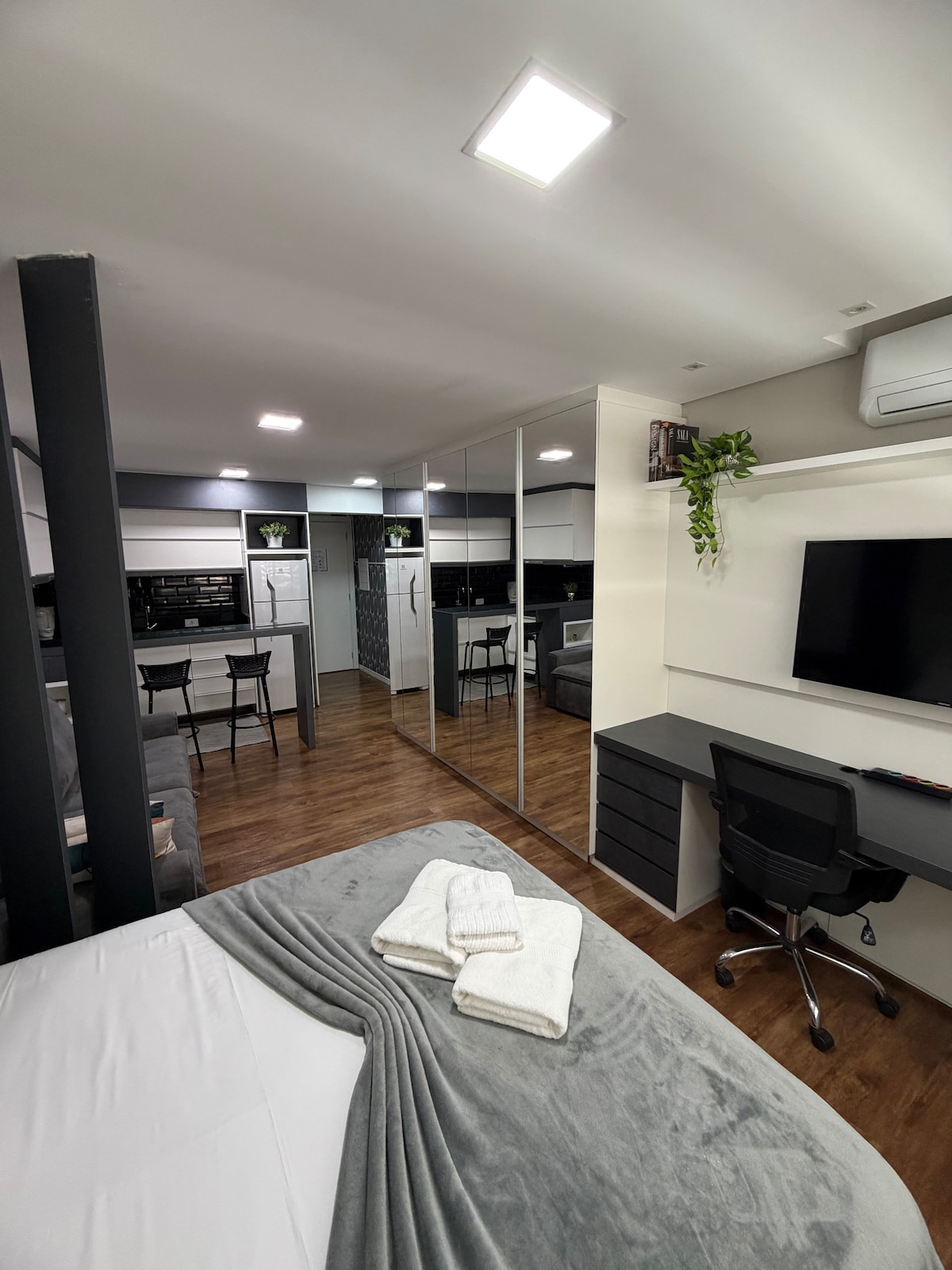Studio moderno, novíssimo, aconchegante, perfeita localização, com uma linda vista da sacada, principalmente a noite . Wi-Fi rápido, mesa de trabalho, TV smart 55” , cama Queen. Ar condicionado (quente/frio). Máquina de lavar e secar roupa e uma linda ilha na cozinha. 50m2 de muito estilo-27ºandar, Silencioso. No Centro/Batel, próximo à comércios, bancos, shoppings, polo gastronômico e Hospital . No prédio :Piscina, academia, sala de jogos, sauna, jacuzzi, portaria 24 horas.