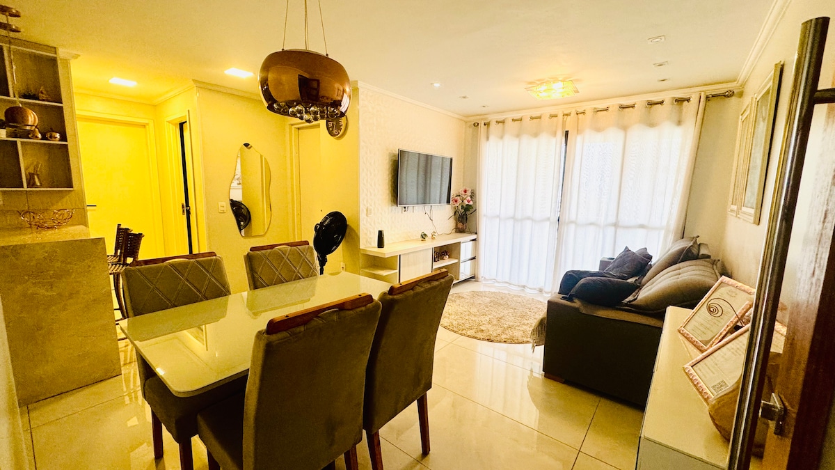 Apto de 3 quartos , sendo uma suíte,com uma varanda incrível COM VISTA PARA O MAR. Nosso espaço foi pensado para proporcionar conforto e bem estar aos nosso hóspedes. Conta com Smart TVs, Wi-Fi 200MB, Netflix, ar condicionados em todos os ambientes, água quente nos chuveiros, cozinha equipada com itens básicos que você precisa para o preparo de refeições em família. Possui, ainda, VAGA DE GARAGEM.
