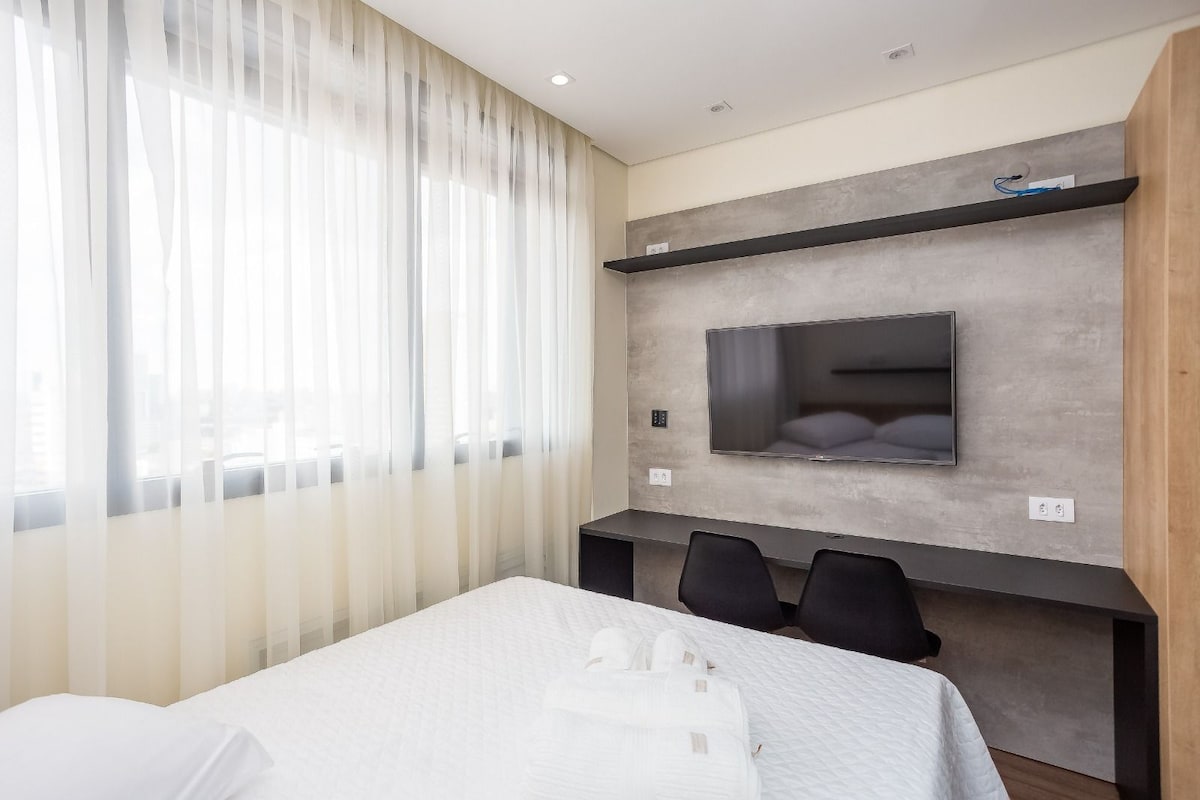 Roupa de cama e banho padrão hotelaria. Colchão novo e padrão hotel . Chuveiro com central a gás. Limpeza padrão hotelaria. Capacidade até 02 adultos. É imprescindível o envio do nome completo e cpf. Não temos vaga incluso na diária. Estacionamento terceirizado no subsolo. Não permitimos visitantes, apenas hóspedes previamente cadastrados. Não aceitamos reservas para terceiros, um dos hóspedes obrigatoriamente deverá ser o solicitante da reserva.