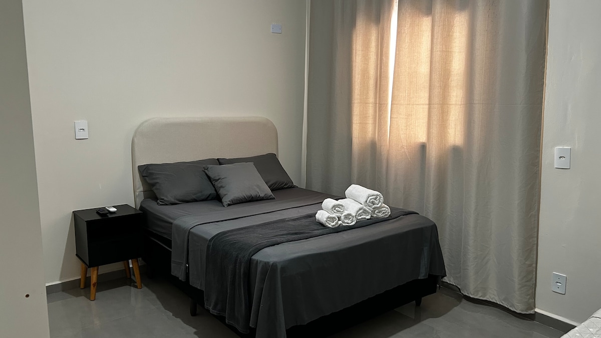 Espaço estilo flat, individual com todo o necessário para a estadia, ar condicionado, enxoval de cama, utensílios de cozinha e domésticos, garagem coberta, entrada exclusiva, wifi rápido, Smart TV com acesso a plataformas de streaming, garagem coberta. Perto das principais rodovias e saída da cidade, empresas e conta com uma variedade de comércios, como restaurantes,padarias, farmácia açougues, sorveteria. O imóvel fica em um prédio residencial em uma área urbana.