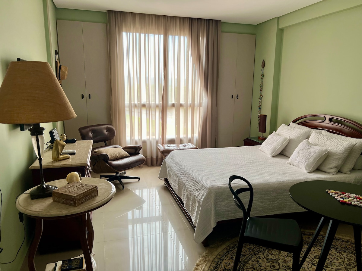 The Suite, spacious and luxurious, has recently been renovated based on a project by one of Brasília's top architecture firms, @minimo arq br. With windows that allow generous natural light to enter, you will be treated to a stunning view of the vast green area that extends to the open horizon, a typical characteristic of our beloved city.