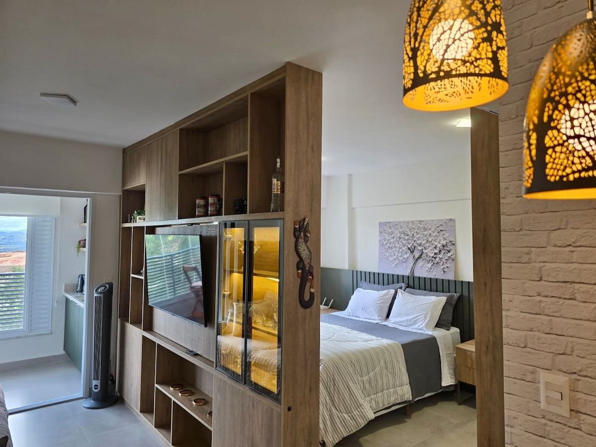 Apartamento studio 32m2, aconchegante e completo. Cama queen, A/C , WIFI 230 MB, aquecedor a gás, smart TV com Chormecast, cozinha completa utensílios, cafeteira elétrica, sala com sofá e mesa de trabalho, berço portatil. Vista livre para praça e central Jd.Colinas. Estacionamento coberto, piscina, lavanderia social, academia, espaço Home Office com WIFI e portaria 24 Horas. Possui fechadura eletrônica e 1 vaga de garagem coberta. O prédio possui mini mercado no andar térreo com diversos itens.