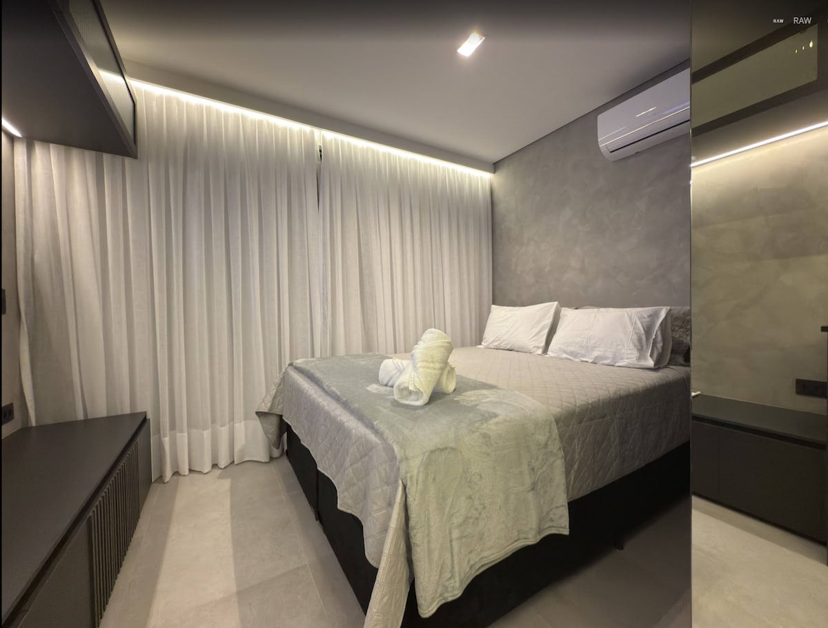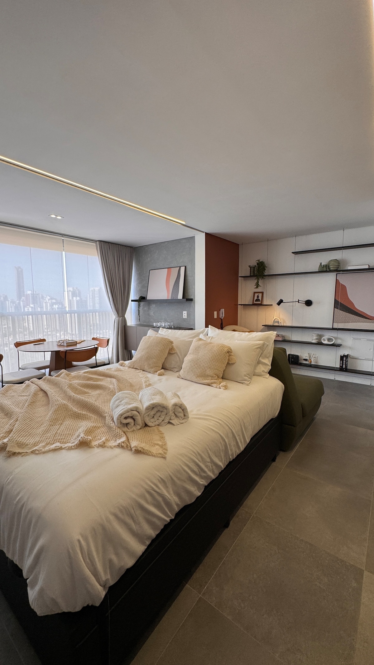 O Studio localizado no Almagah 227, foi projetado com atenção a cada detalhe para oferecer conforto, praticidade e um design moderno. O móvel flexível que vira sofá garante melhor circulação e pode ser usado para reuniões ou momentos de descanso. Há área exclusiva para refeições com futon e mesa, cozinha equipada com geladeira, armário espaçoso e cafeteira de expresso. A iluminação versátil e a smart TV grande completam a experiência.