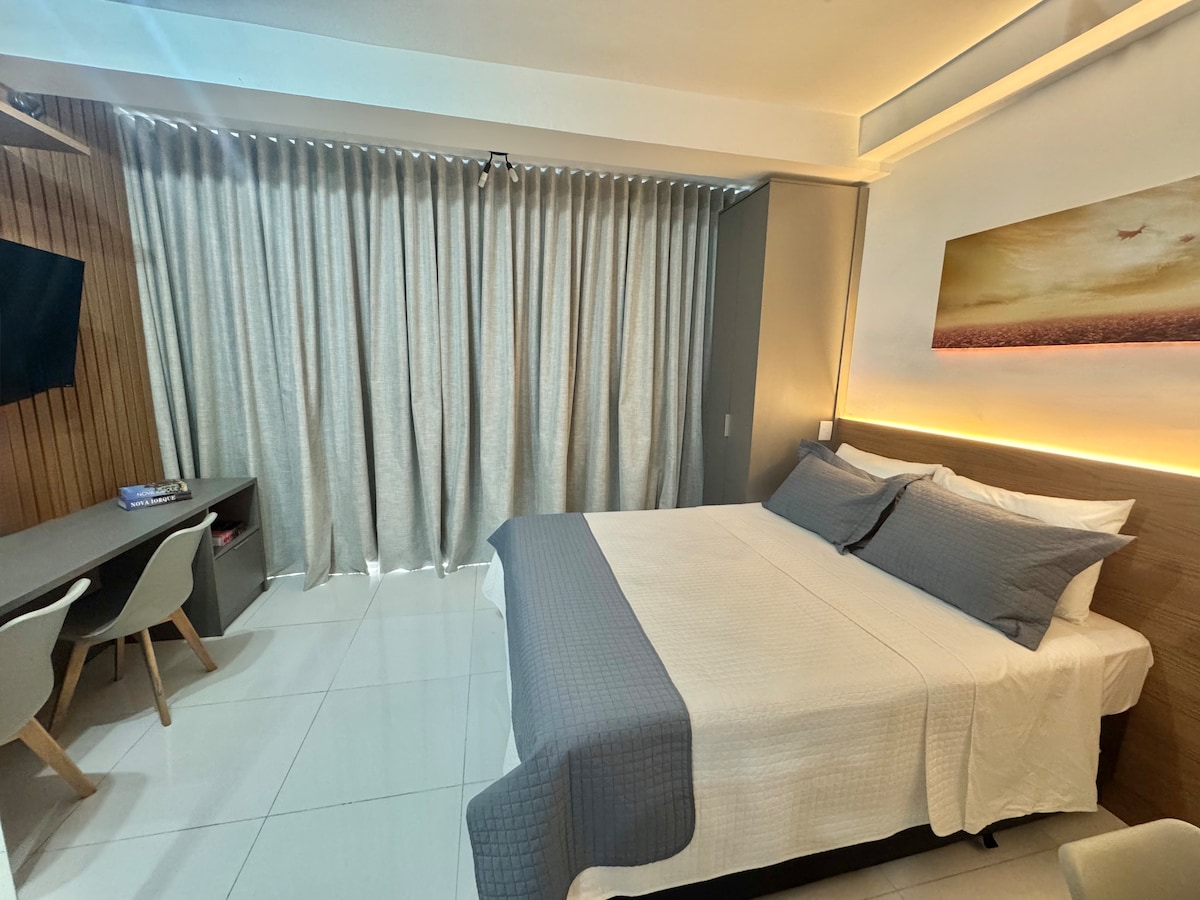 A modern, comfortable, and energetic retreat in the heart of Tatuapé, just steps from the subway and the Boulevard and Tatuapé shopping malls. The studio boasts a well-designed 24m² (24 square meters) with a super comfortable double bed, blackout curtains, air conditioning, a 55-inch Smart TV, fast Wi-Fi, a fully equipped kitchen (refrigerator, stovetop, microwave, utensils, and coffee to start the day right), plus bed linens, towels, and basic toiletries.
