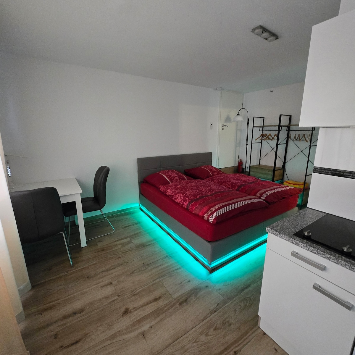 Das Zimmer mit integrierter Küchenecke und separatem Duschbad/Toilette hat einen eigenen Eingang und ist barrierefrei zu erreichen. Es befindet sich in einem Zweifamilienhaus. Die Küche ist mit einer Basic-Kocheinrichtung und Kühlschrank ausgestattet. Schrank, Kommode, ein Tisch und zwei Stühle, ein Doppelbett. W-LAN ist vorhanden.