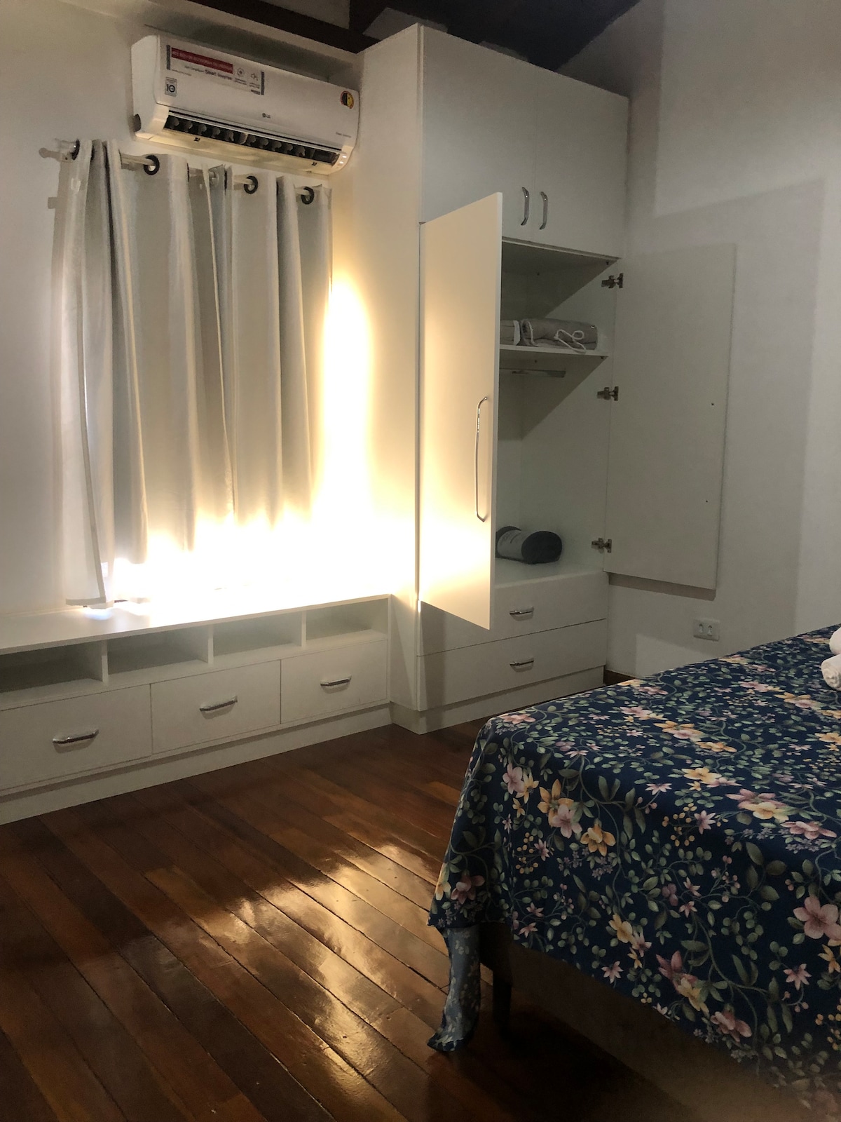 Trata-se de um loft simples, porém muito aconchegante. Possui sala ampla com sofá, televisão, cozinha equipada com geladeira, fogão, forno elétrico, airflyer, liquidificador e utensílios de cozinha. banheiro social em baixo completo Ventilador de pé grande O quarto dispõe de cama King com massagem e banheiro completo armário embutido e ar condicionado. Varanda externa com rede e garagem coberta para um veículo.
