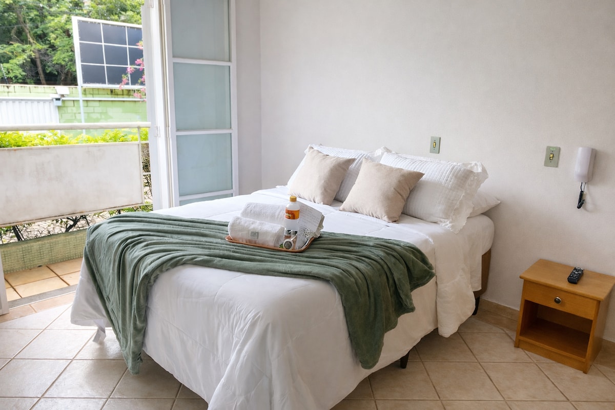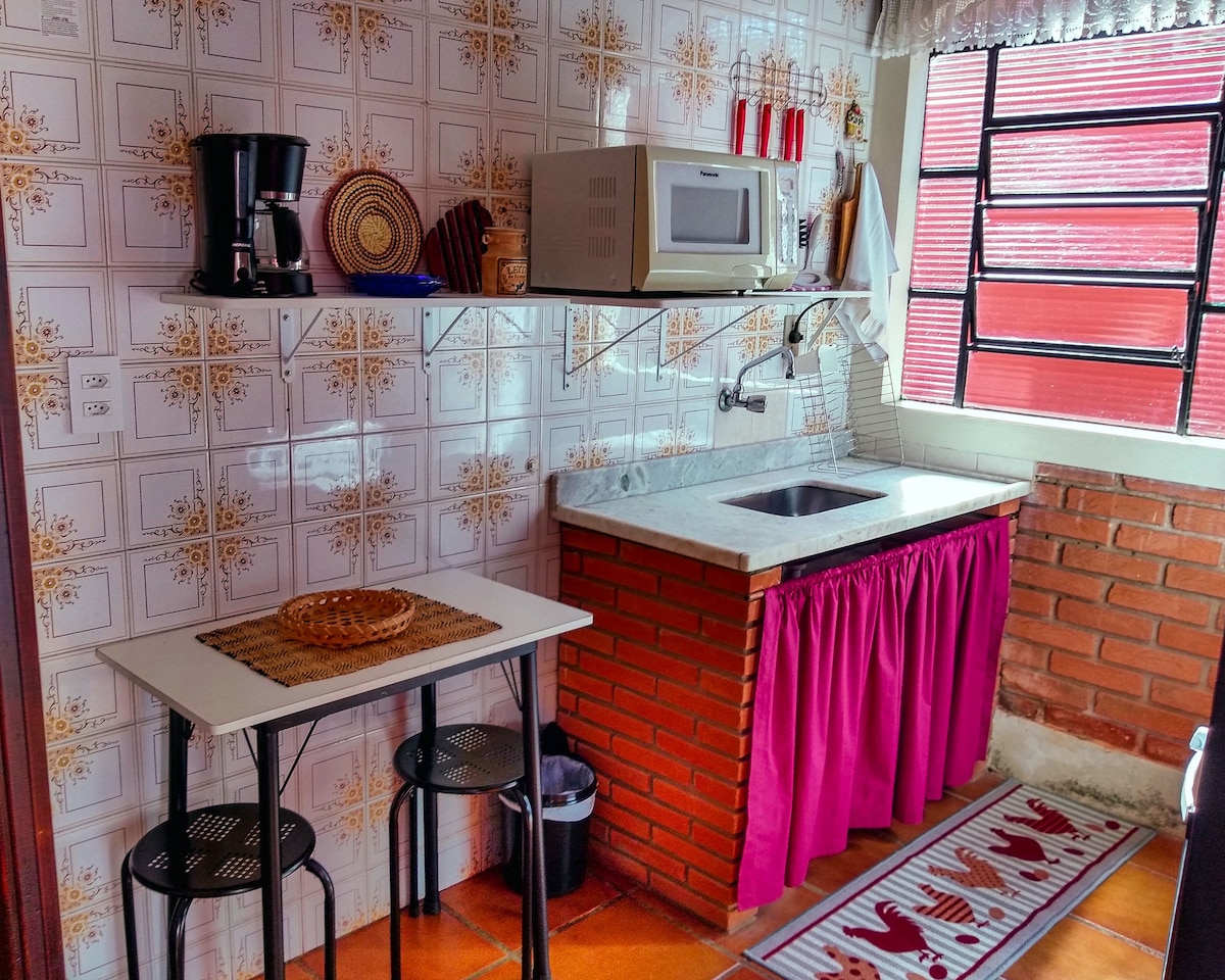 Guest house in the backyard of my home, detached, private access to the swimming pool! - Refrigerator, microwave, mineral water, air fryer, coffee maker, and electric kettle: coffee, cappuccino, tea and cheese bread for breakfast! - Double bed, ceiling fan, wardrobe - Reclining sofa, dining and work tables - TV with 120 channels + Netflix, Disney+, HBO Max, AppleTV and Globoplay - One parking space - Restaurants and shops within walking distance - Close to Lagoa do Taquaral