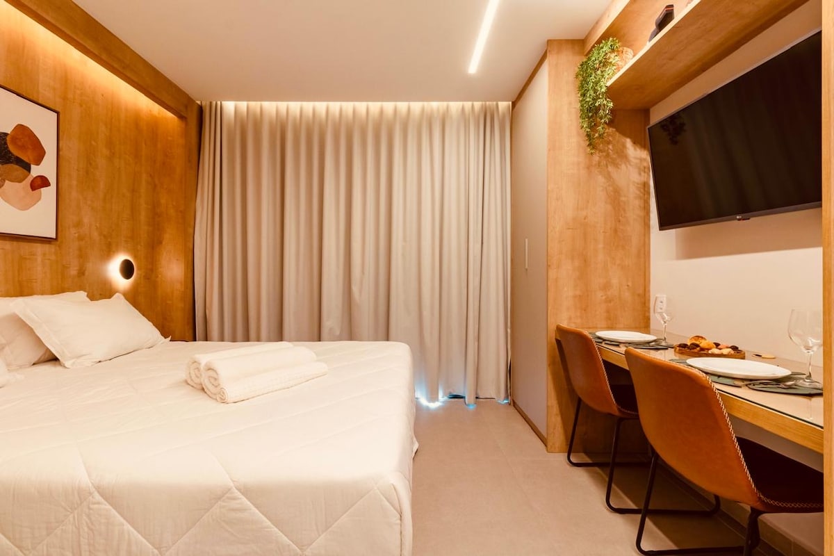 Work and relax with a 180° panoramic view on the 21st floor, just meters from Av. Paulista and Higienópolis-Mackenzie subway. Modern studio with air conditioning, ultra-fast Wi-Fi (461 Mbps), a comfortable workspace, and self check-in with a smart lock. In the building, enjoy a suspended Olympic pool, fully equipped gym, dry and steam saunas, laundry, and free parking.