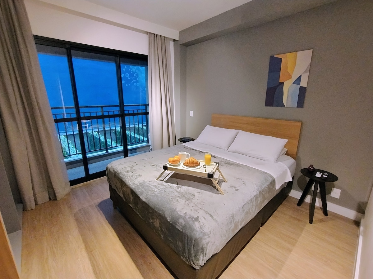 Stylish 50 m² apt. located at Bela Vista, has 24hr doorman. 2 bedrooms (only 1 with AC, and queen bed, the second one is quite small and can be used as an office, fitting a double-sized sofa-bed) and 1 bathroom. With amazing views from every window, it is a great place to work and relax. The private jet-tube at the balcony is a fantastic spot to enjoy the city views. Ideal for couples, professionals or small families looking for comfort, convenience, and one of the best views in the city.