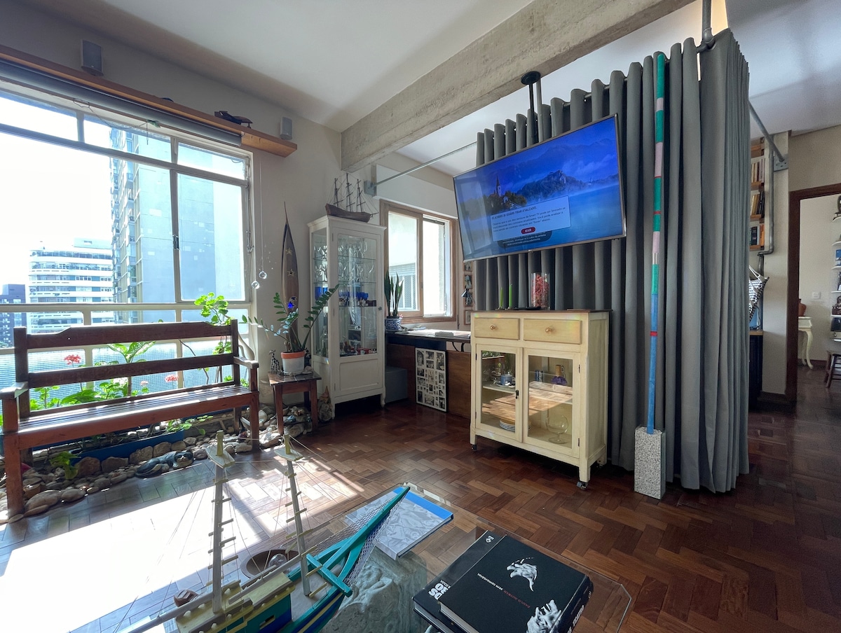 No topo do Copan, de frente para a Avenida Ipiranga, este estúdio de 44m² nos convida a flutuar sobre a paisagem de São Paulo. A sensação de leveza vem do piso em pastilhas, que, após a reforma, se estende por todo o interior do apartamento, criando continuidade visual e integração com o breeze característico da fachada norte.