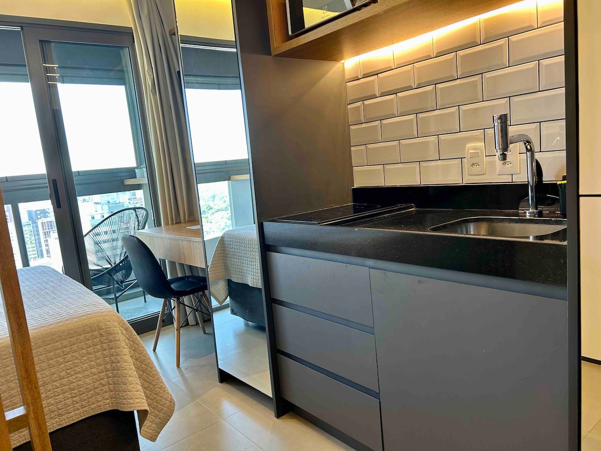 Studio completo e aconchegante onde você irá encontrar tudo para o seu conforto! O studio oferece: • Cama queen e um sofá espaçoso • Ar condicionado e aquecedor • Toalhas e roupas de cama • Utensílios de cozinha O prédio também conta com piscina de borda infinita no 20o andar, academia, sauna, garagem e um mini mercado Aqui tem tudo o que você precisa para trabalhar e/ou relaxar com uma vista maravilhosa de SP