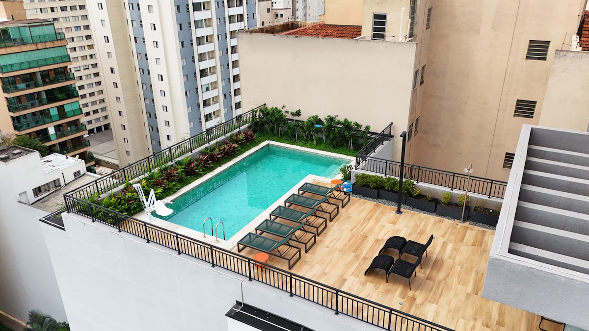Work and relax with a 180° panoramic view on the 21st floor, just meters from Av. Paulista and Higienópolis-Mackenzie subway. Modern studio with air conditioning, ultra-fast Wi-Fi (461 Mbps), a comfortable workspace, and self check-in with a smart lock. In the building, enjoy a suspended Olympic pool, fully equipped gym, dry and steam saunas, laundry, and free parking.