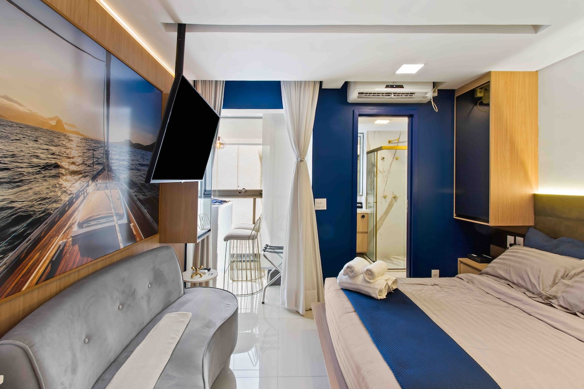 Experience One Eleven in Vila Olimpia. This modern apartment features large windows with breathtaking city views and natural light. The unit boasts 600 Mbps internet and a 4K HD TV. For total comfort, it has a Hot/Cold AC system: 27,000 BTU/h unit in the living room and 10,000 BTU/h in the bedroom. The bedroom is quiet and dark for a restful sleep. Impeccably maintained, you’ll be walking distance to top restaurants and business hubs—a safe, upscale retreat with a stunning urban backdrop.