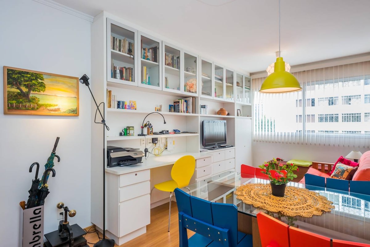 Stylish 50 m² apt. located at Bela Vista, has 24hr doorman. 2 bedrooms (only 1 with AC, and queen bed, the second one is quite small and can be used as an office, fitting a double-sized sofa-bed) and 1 bathroom. With amazing views from every window, it is a great place to work and relax. The private jet-tube at the balcony is a fantastic spot to enjoy the city views. Ideal for couples, professionals or small families looking for comfort, convenience, and one of the best views in the city.