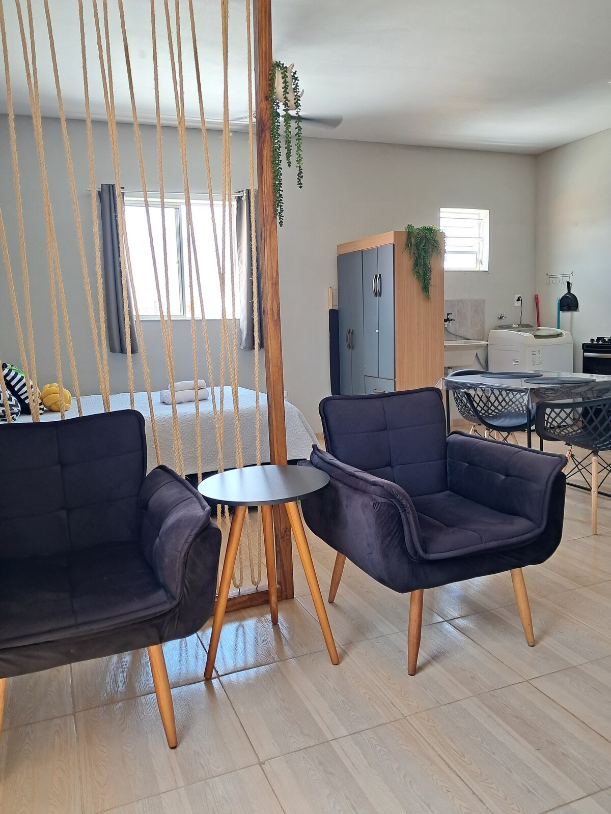 Estamos em um bairro bem tranquilo, residencial e arborizado, porém sem muitos comércios ao redor. O espaço tem outras kitnets, por isso, aglomerações e sons altos não são permitidos. O espaço foi preparado com muito carinho e espero que meus hóspedes tenham uma boa experiência e se sintam em casa. 5 minutos da Rodovia do Açúcar 15 minutos do centro 15 minutos da rodoviária 20 minutos da rua do Porto 20 minutos da ponte Pênsil 40 minutos do Thermas Water Park obs: distância de carro